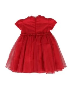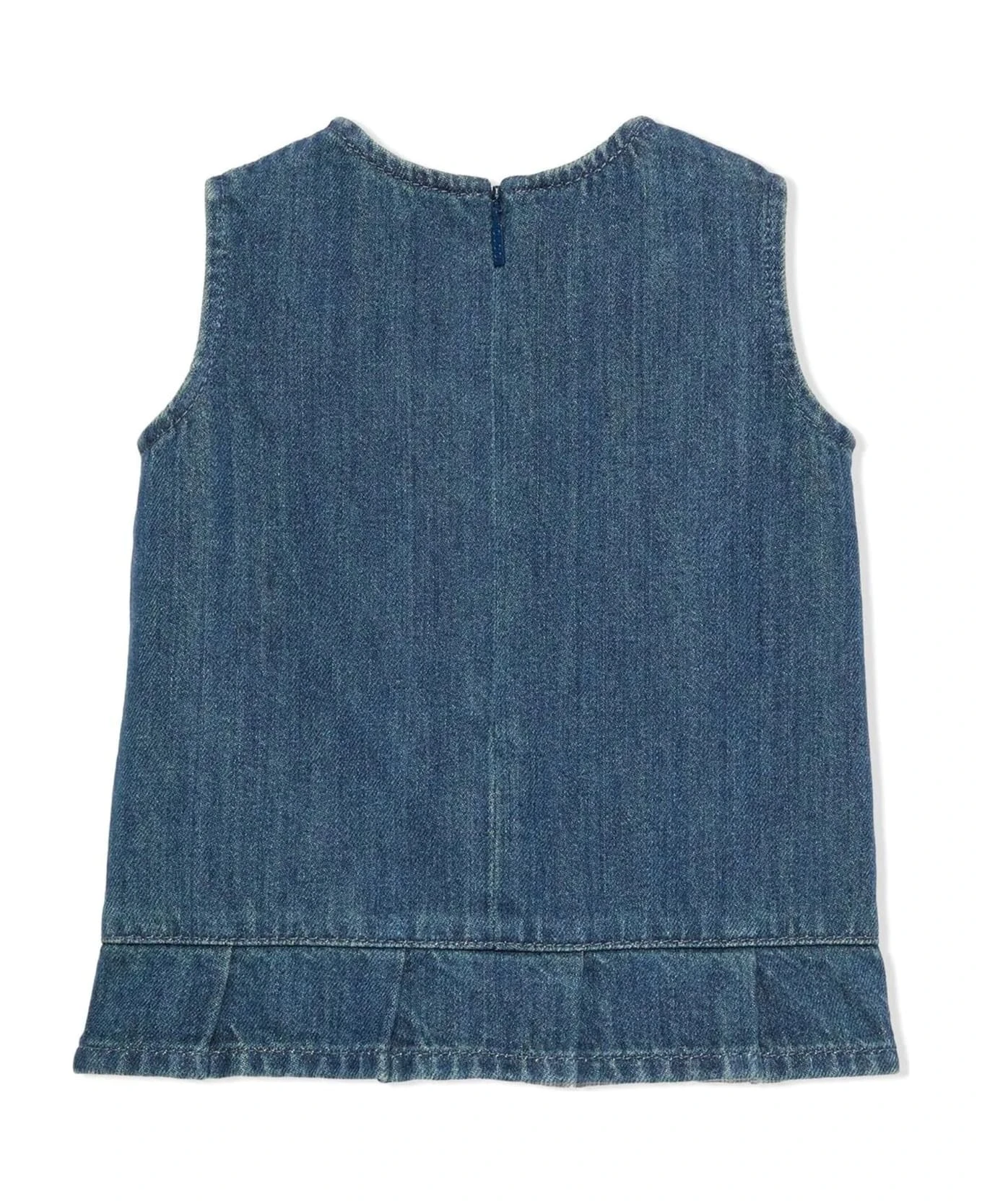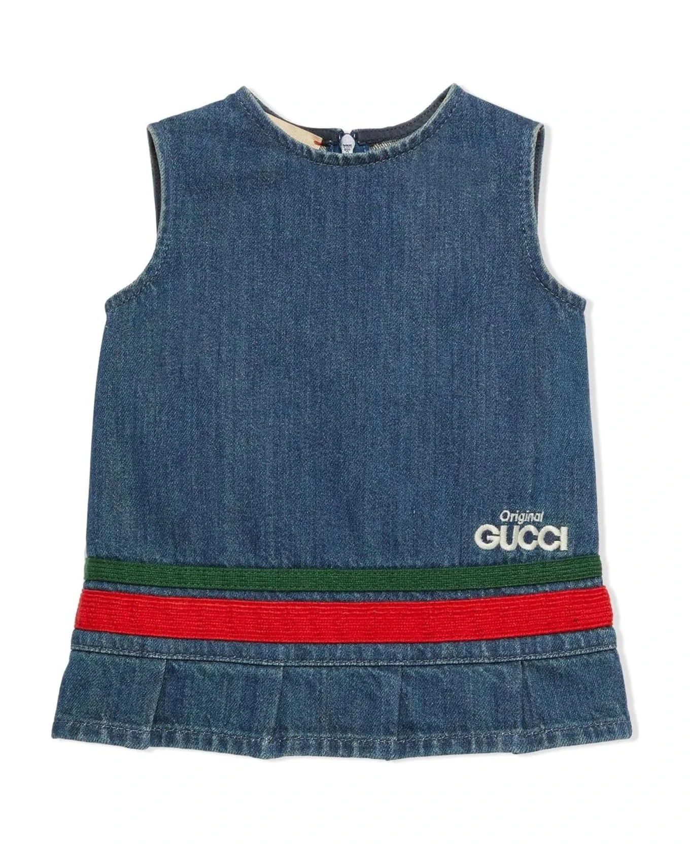Baby Original Gucci denim dress, red and green ribbon details, unlined, sleeveless, pleated details, back zip closure