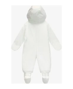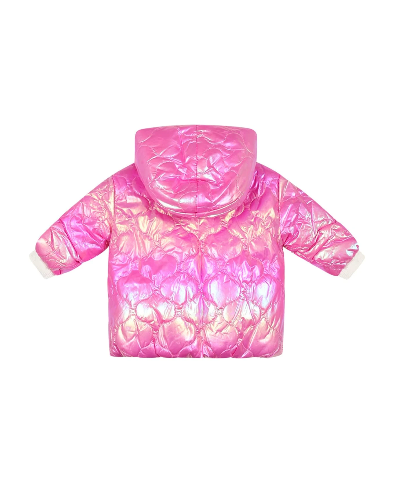 Metallic pink padded coat, made from reflective fabric with all-over hearts; it is lined with ivory faux shearling and it is equipped with hood, closure with zip and side pokcets, embellished with trim in ivory faux shearling.