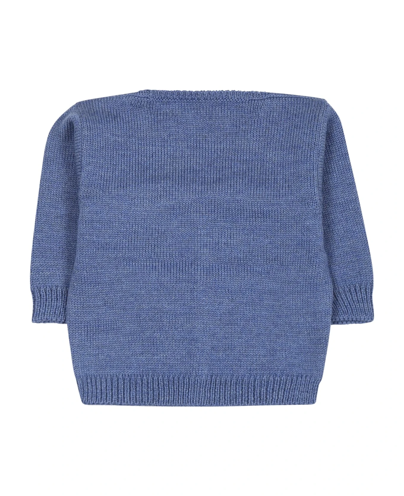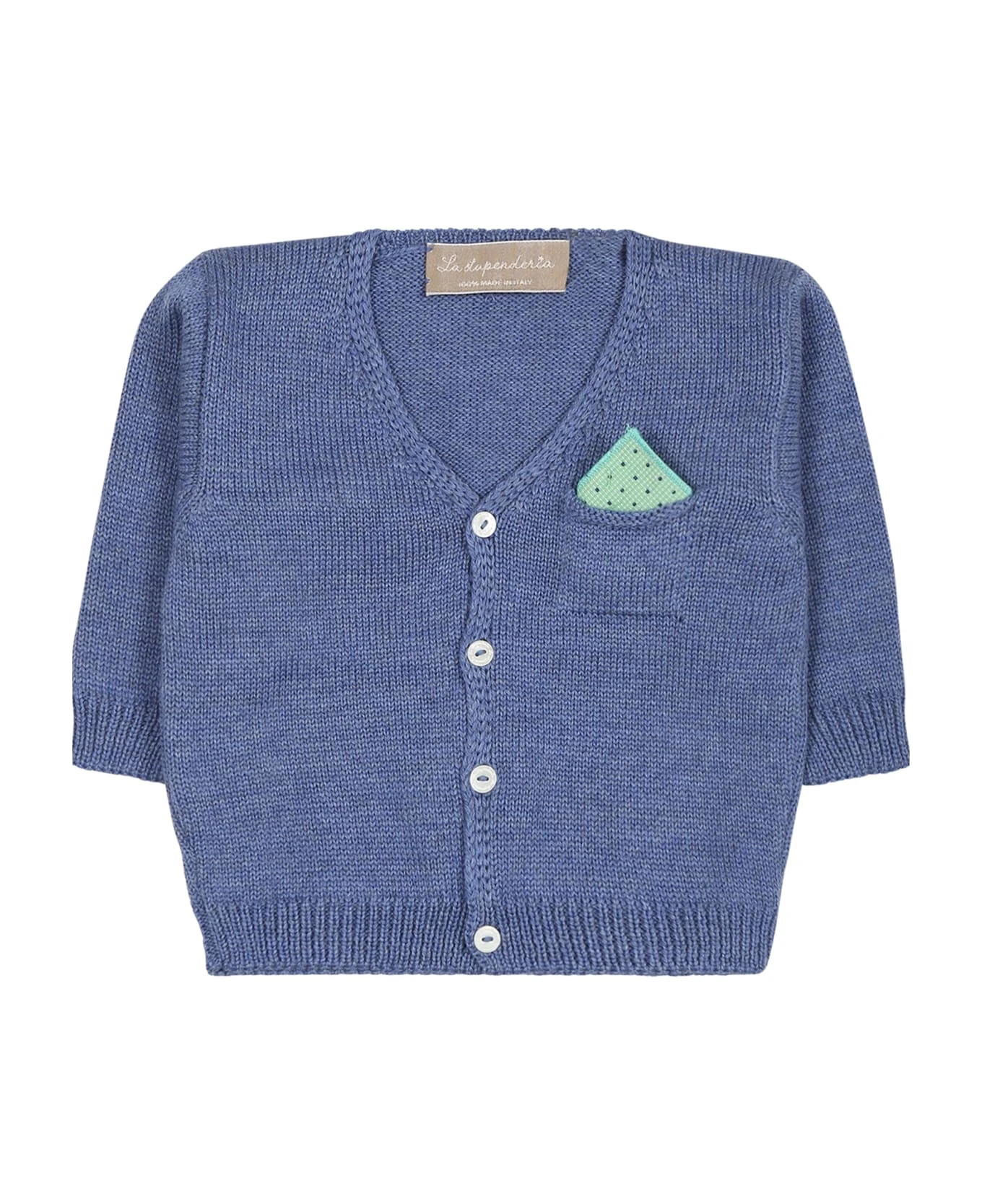 Blue cardigan in wool, with long sleeves, with V-neck, ribbed cuffs and hem, front closure with buttons, chest pocket with green pochette.