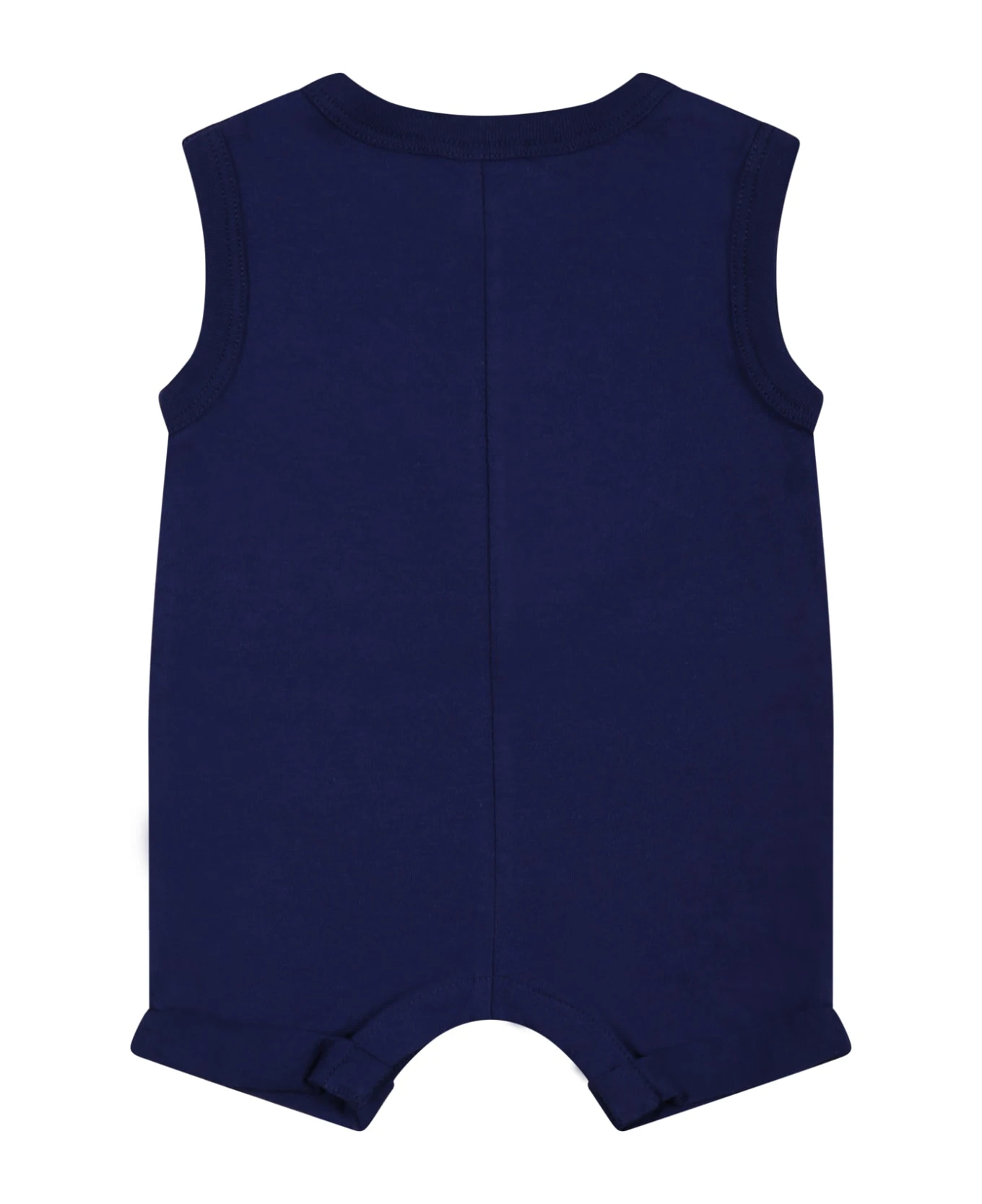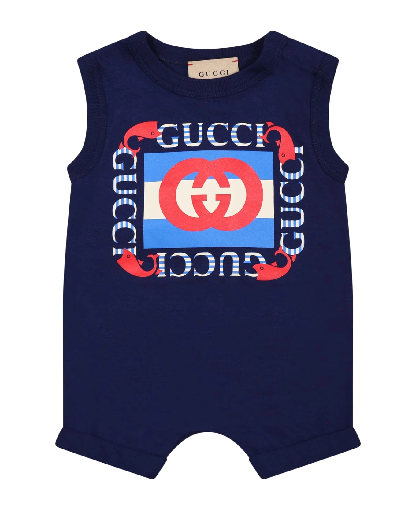 Blue set composed of romper and hat. Sleeveless romper in blue cotton jersey, with ribbed crew neck and snap button closure between the legs; it is embellished with vintage Gucci logo and whale print. Blue cotton hat, with turn-up, embellished with Gucci and whale embroidery. It is part of the Gucci Cosmogonie children’s collection, reflecting Gucci’s passion for the beauty of the natural world.