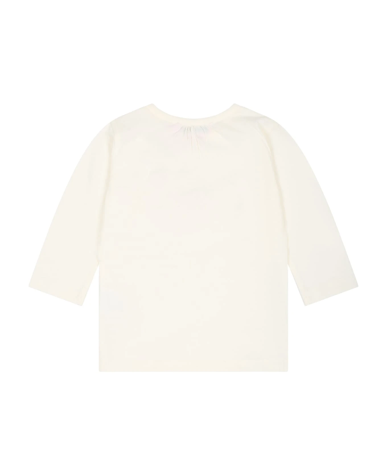 Ivory cotton t-shirt, long sleeves, with crew neck and button closure on the shoulder. It is embellished with embroidered cherries and logo, on the front.