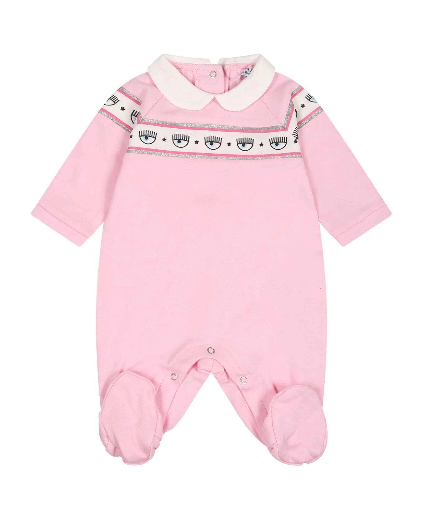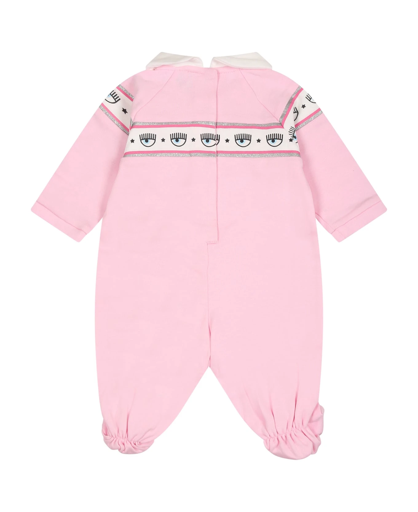 Pink babygrow, long sleeves, with peter pan collar, feet, snap fastening on the back and between the legs. It is embellished with eyester band, pink and silver details, on the front and on the back.
