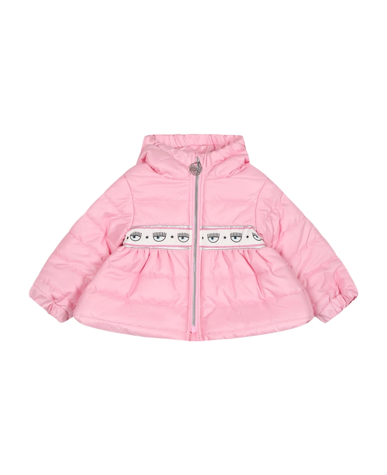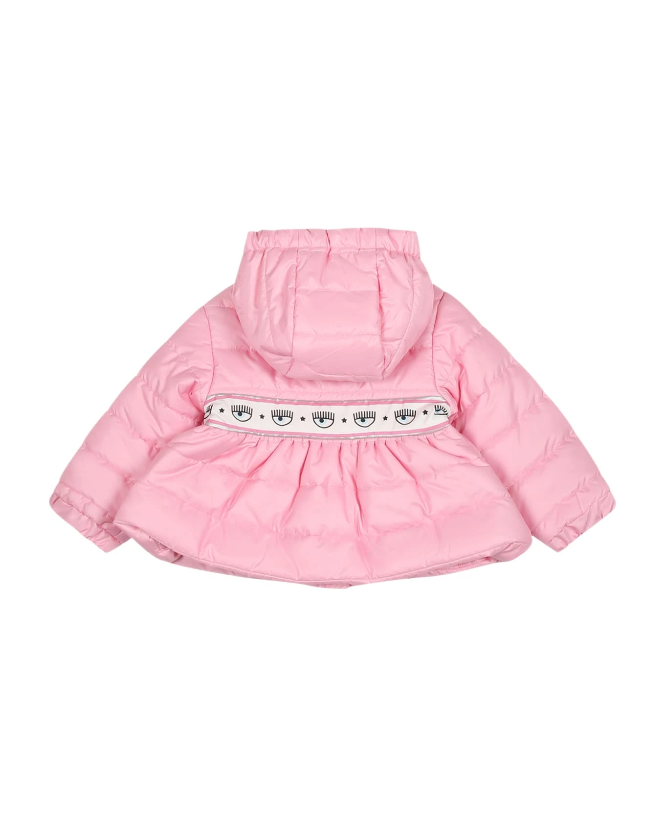 Pink down jacket, slightly padded, with long sleeves, hood, front zip closure, side pockets and elasticated cuffs. It is embellished with band with iconic eyesstars, on the front and on the back.