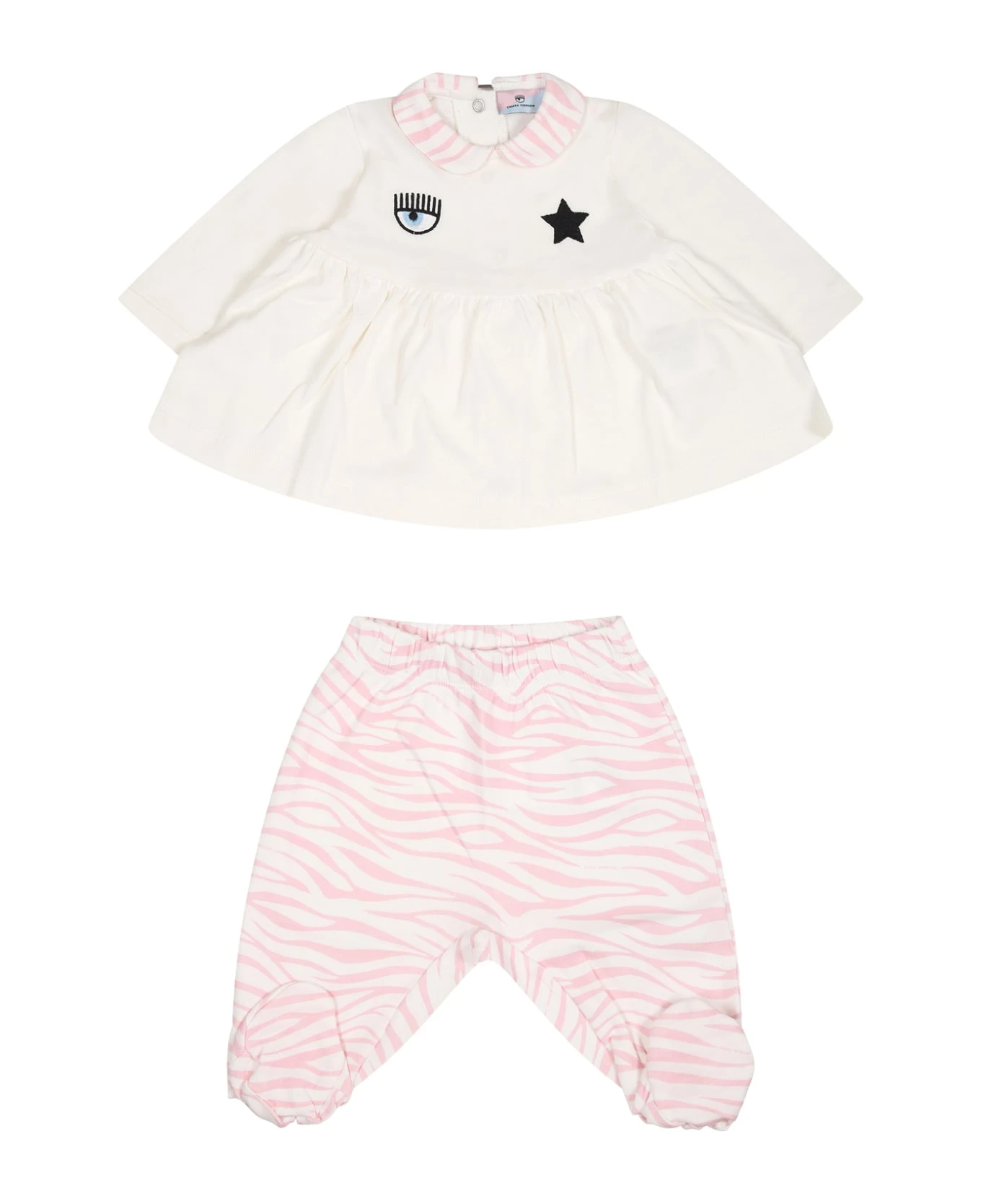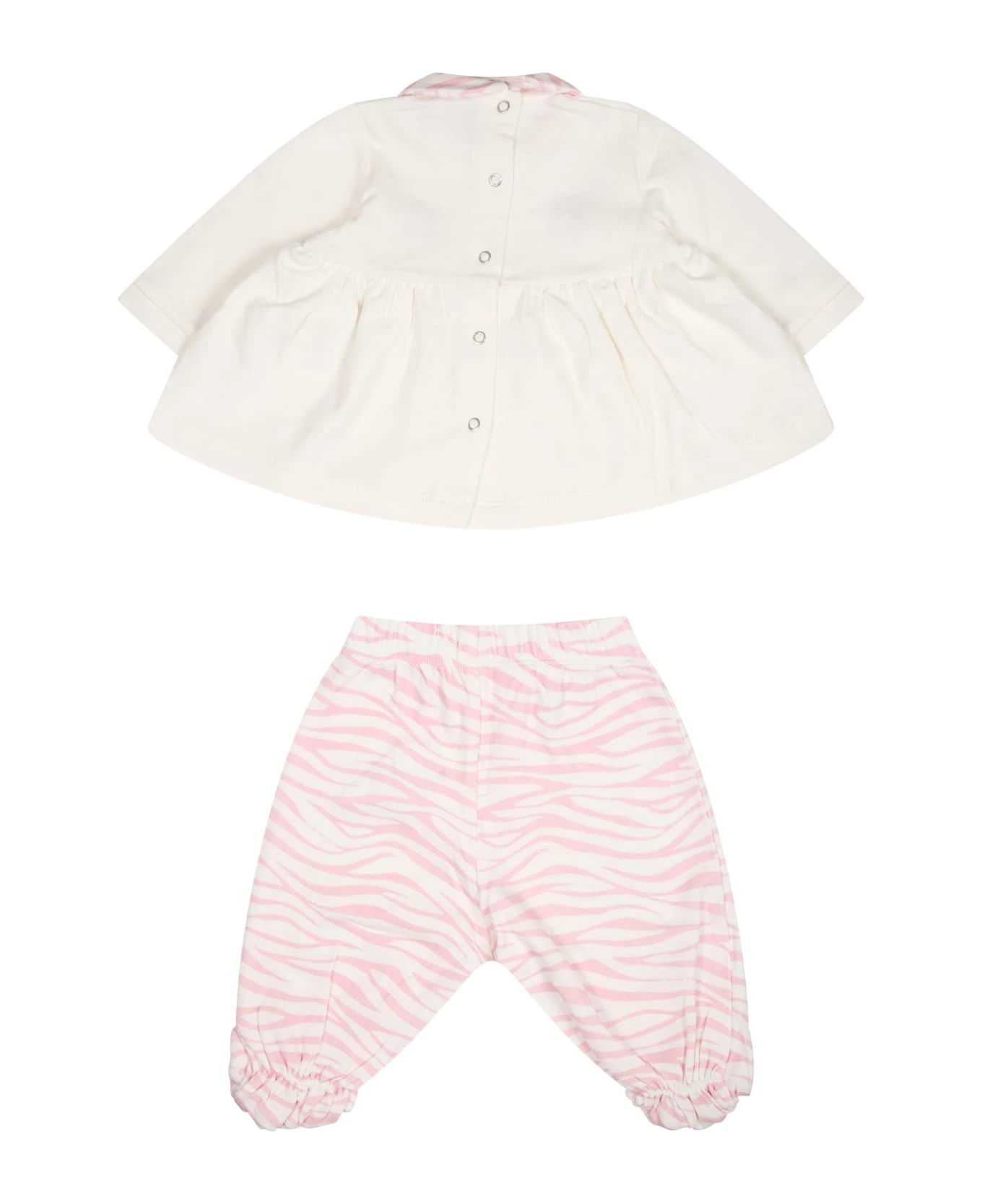 White cotton suit, composed of t-shirt and trousers; long-sleeved t-shirt, with peter pan collar, snap button closure on the back; it is embellished with embroided eyestar on the front; pantsi with elasticated waist and feet; they are embellished with all over pink zebra print.