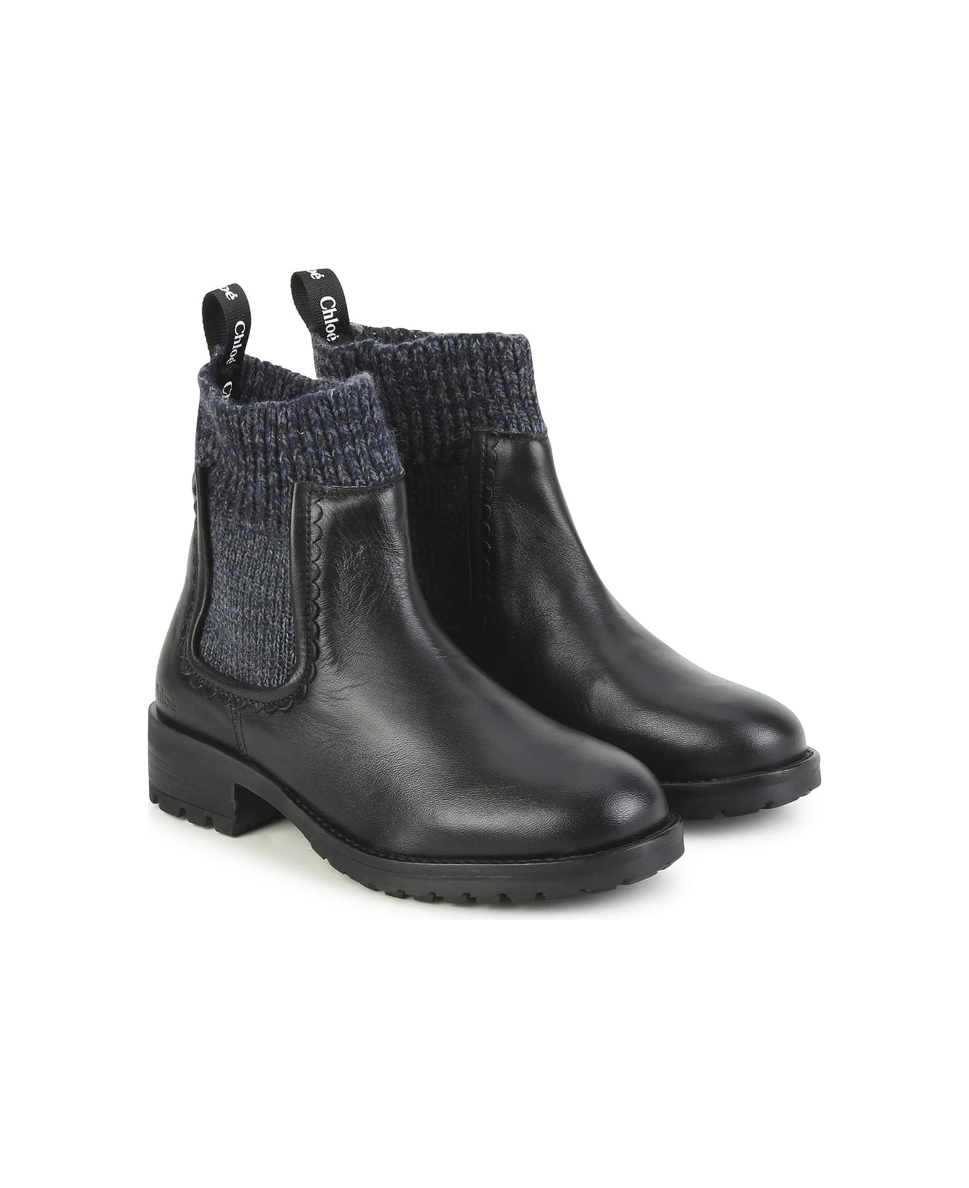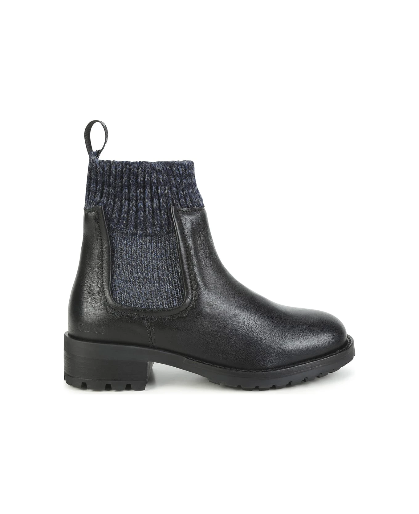 Chloé Kids ankle boots crafted from black leather with a melange navy blue knitted sock insert. Model featuring a round toe, a slip-on design, a rear pull-on and a black rubber sole.