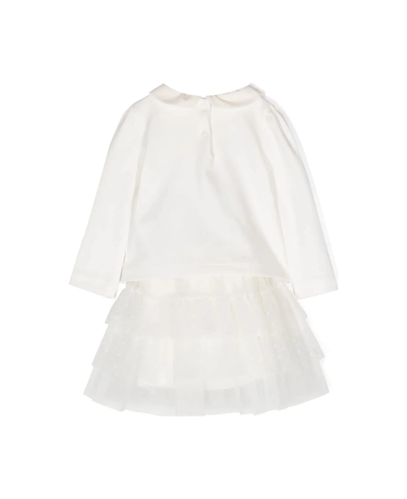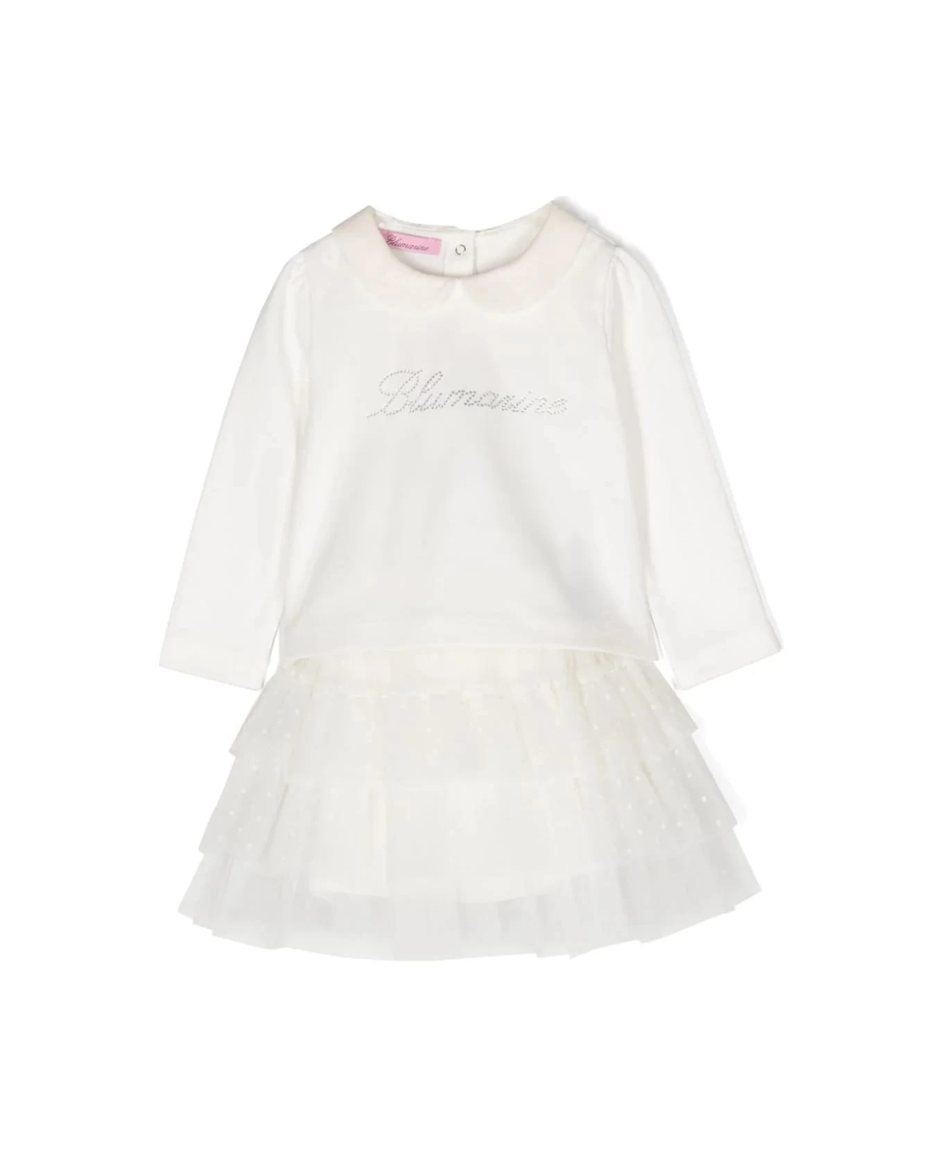 White, cotton, tulle inserts, synthetic diamond decoration, insert design, Peter Pan collar, back button closure, long sleeves and straight hem. Composition