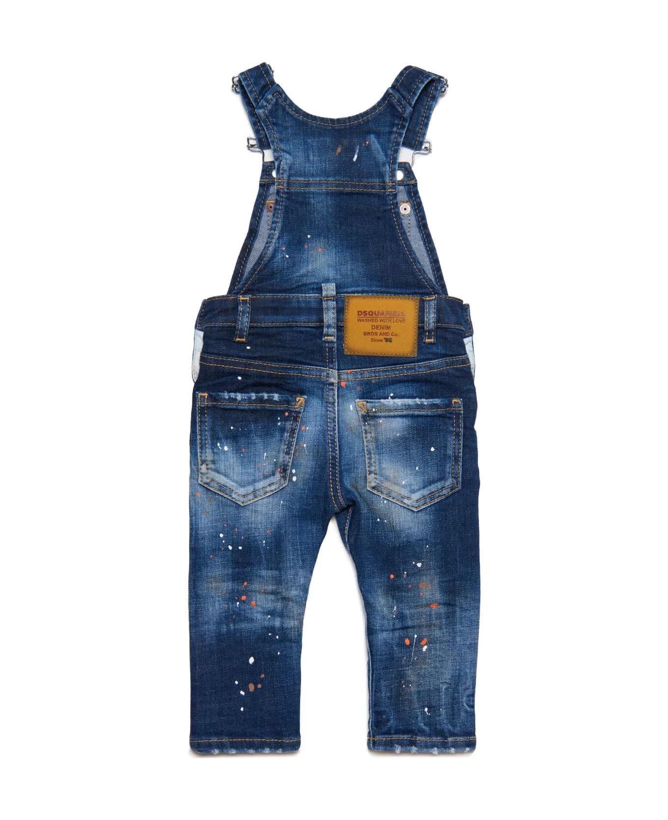 Dark blue denim dungarees distinguished by color-contrasting shaded areas, mended breaks, color spots and patches of different fabrics. Features a flag logo at the flap and a front pocket at the top. A perfect garment to give character to casual outfits.