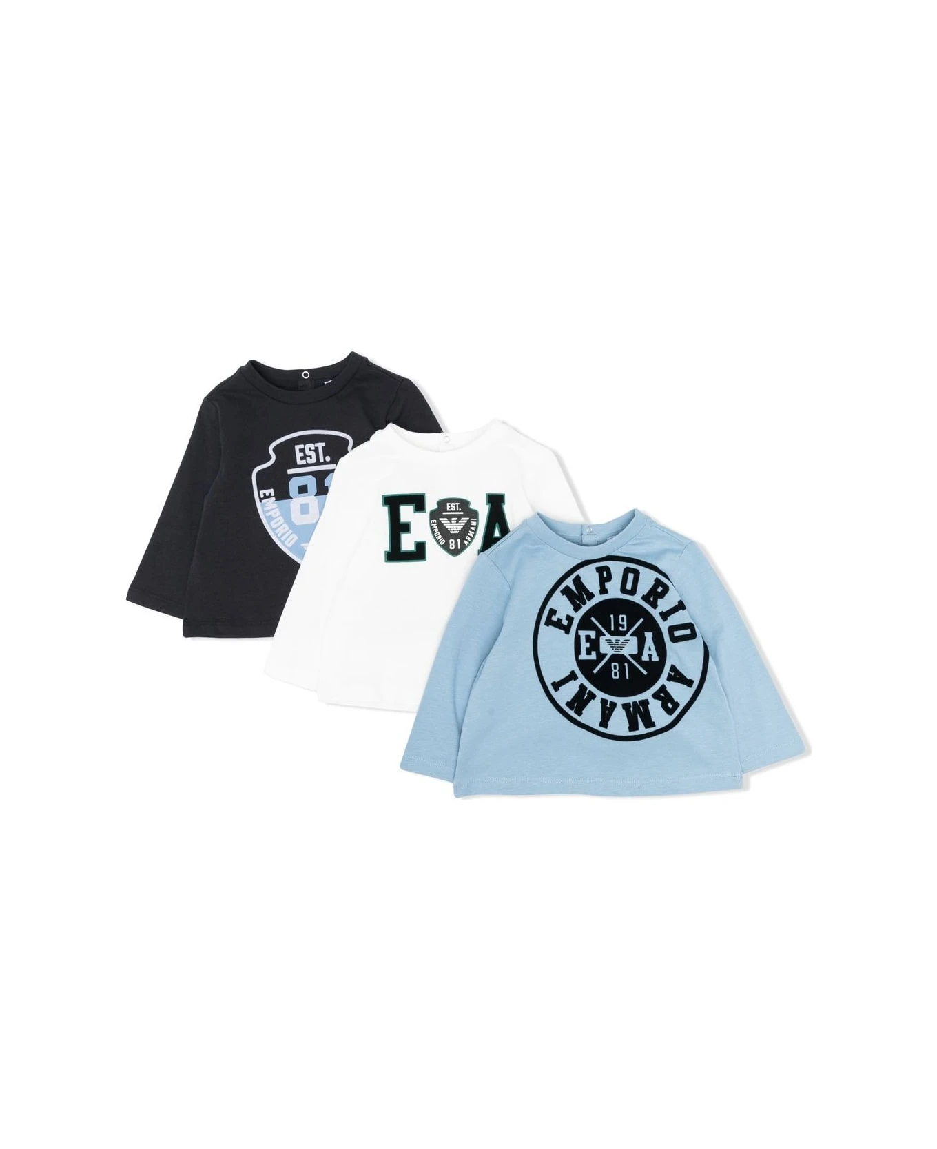 pack of three graphic-print T-Shirts from Emporio Armani Kids featuring blue, white, cotton, pack of three, graphic print to the front, round neck, concealed press-stud fastening, long sleeves and straight hem.