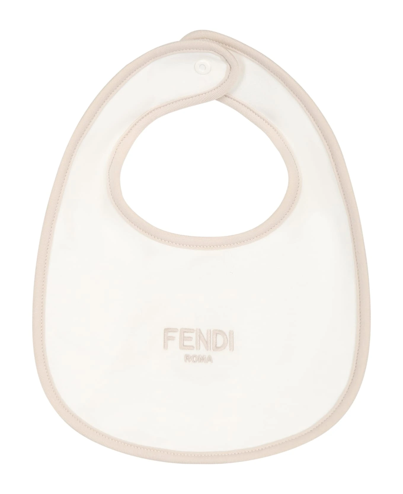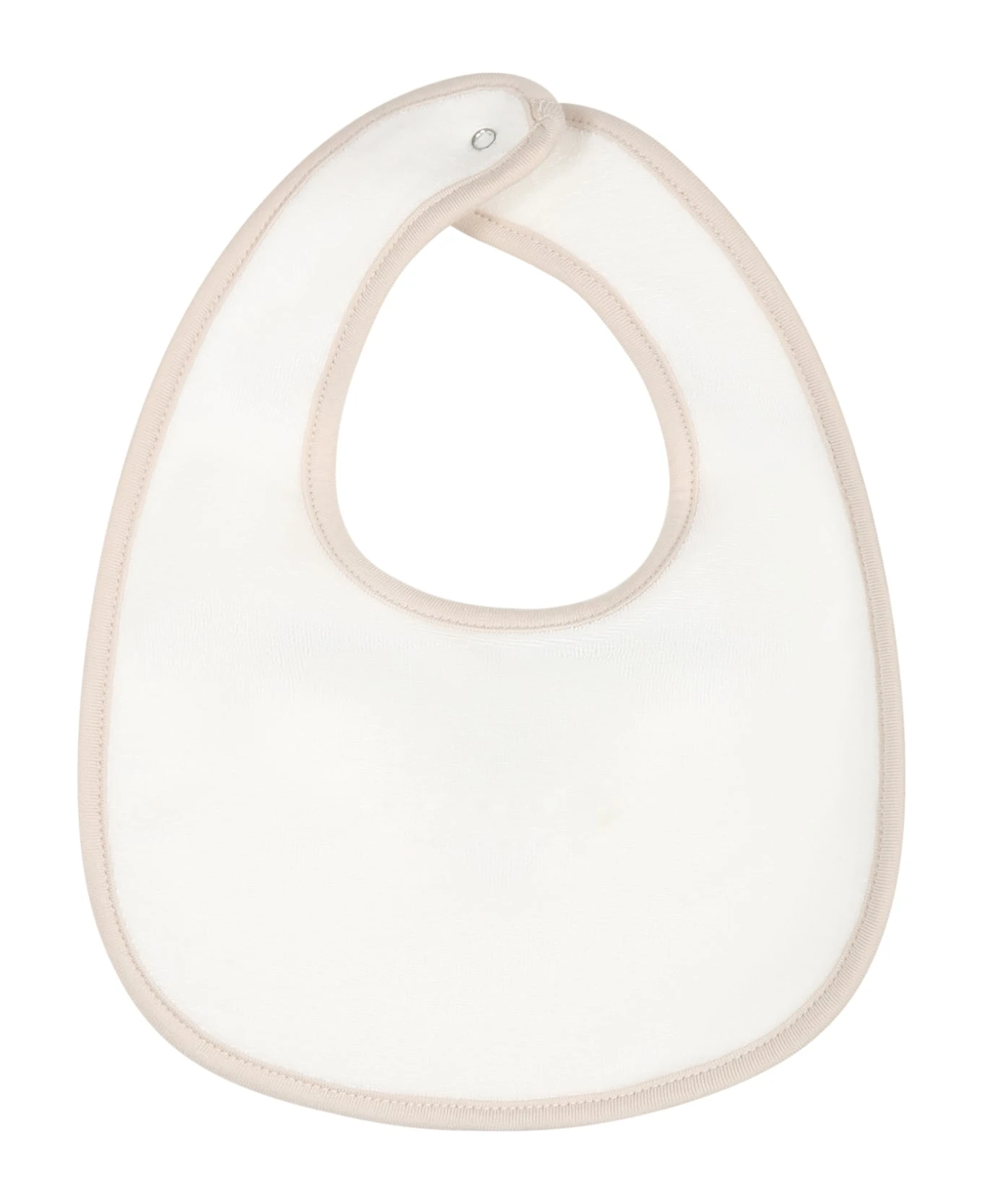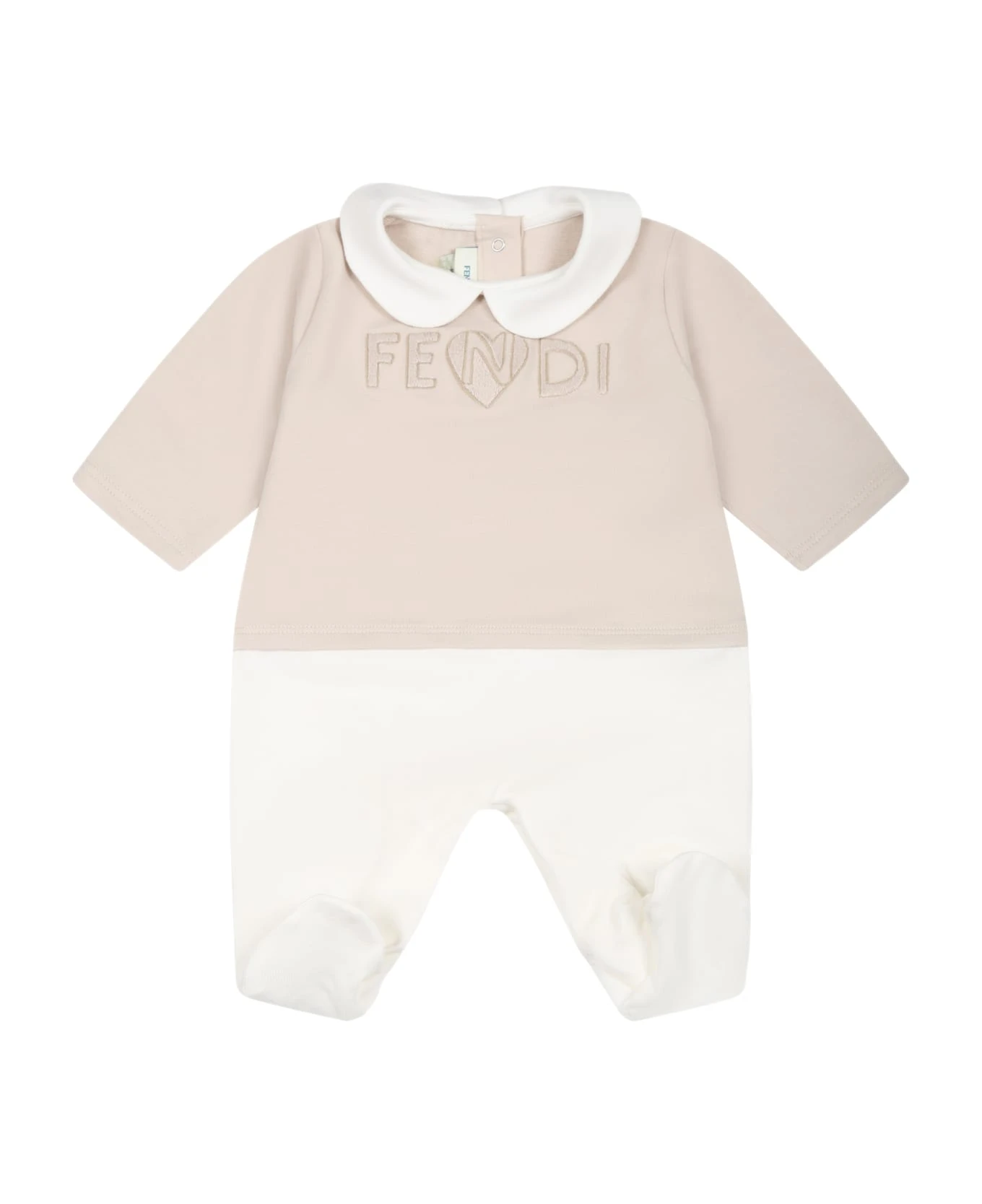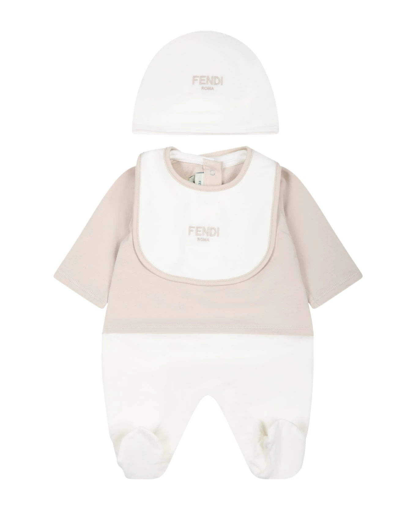 Beige cotton set, composed of babygrow, hat and bib; onesie with long sleeves, peter pan collar, snap closure on the back and between the legs, feet; it is embellished with embroided logo and heart, on the front; white bib with snap button closure at back, white hat with cuff; they are embellished with beige logo embroided on the front.