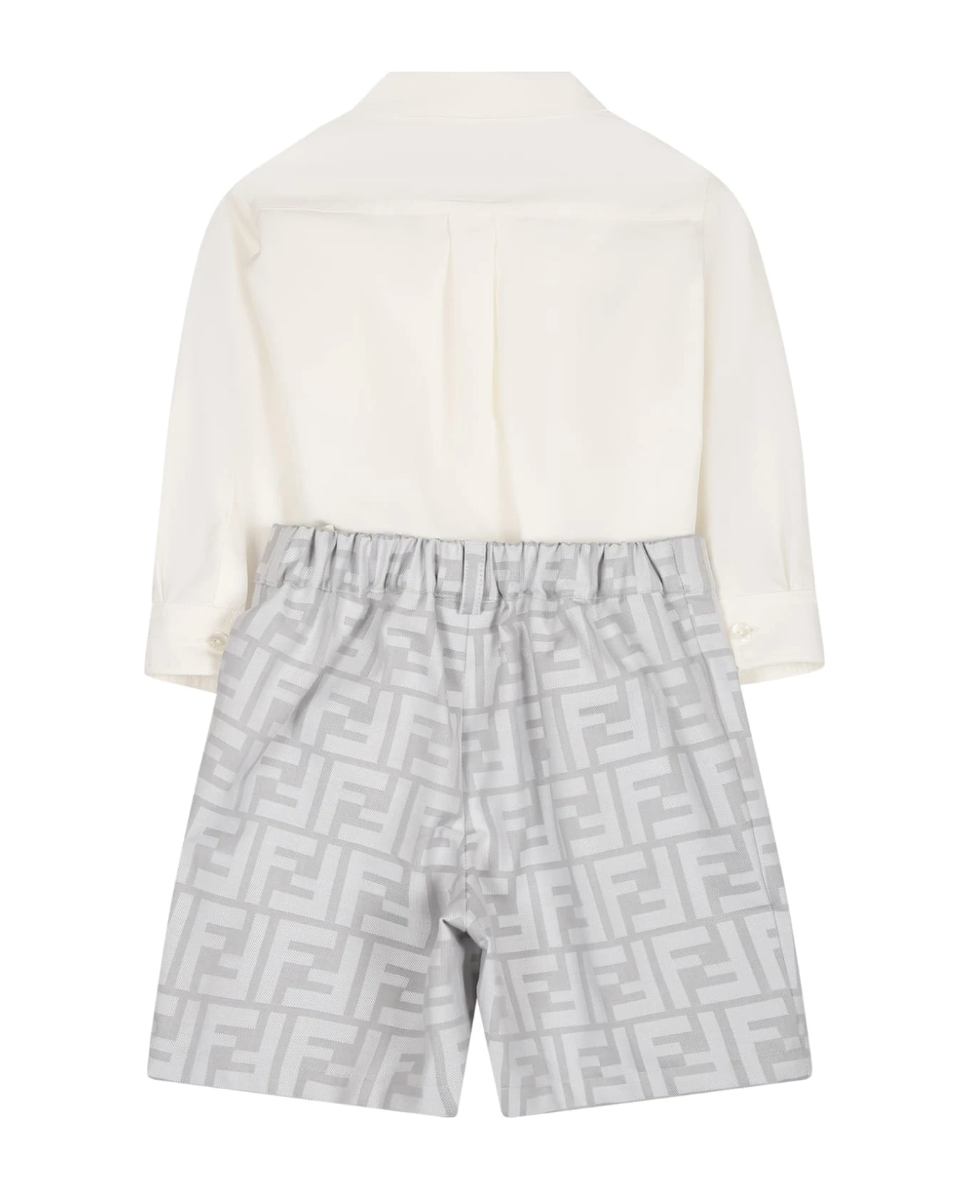 White suit composed of shirt and shorts; shirt with long sleeves, collar, front closure with buttons; it is embellished with iconic double F on the chest, gray shorts with belt loops, elastic waistband; they are embellished with the iconic double F all-over.