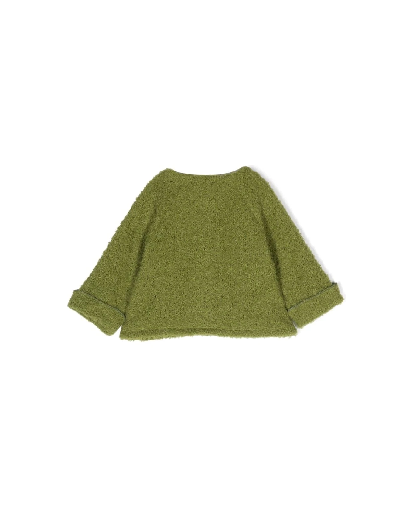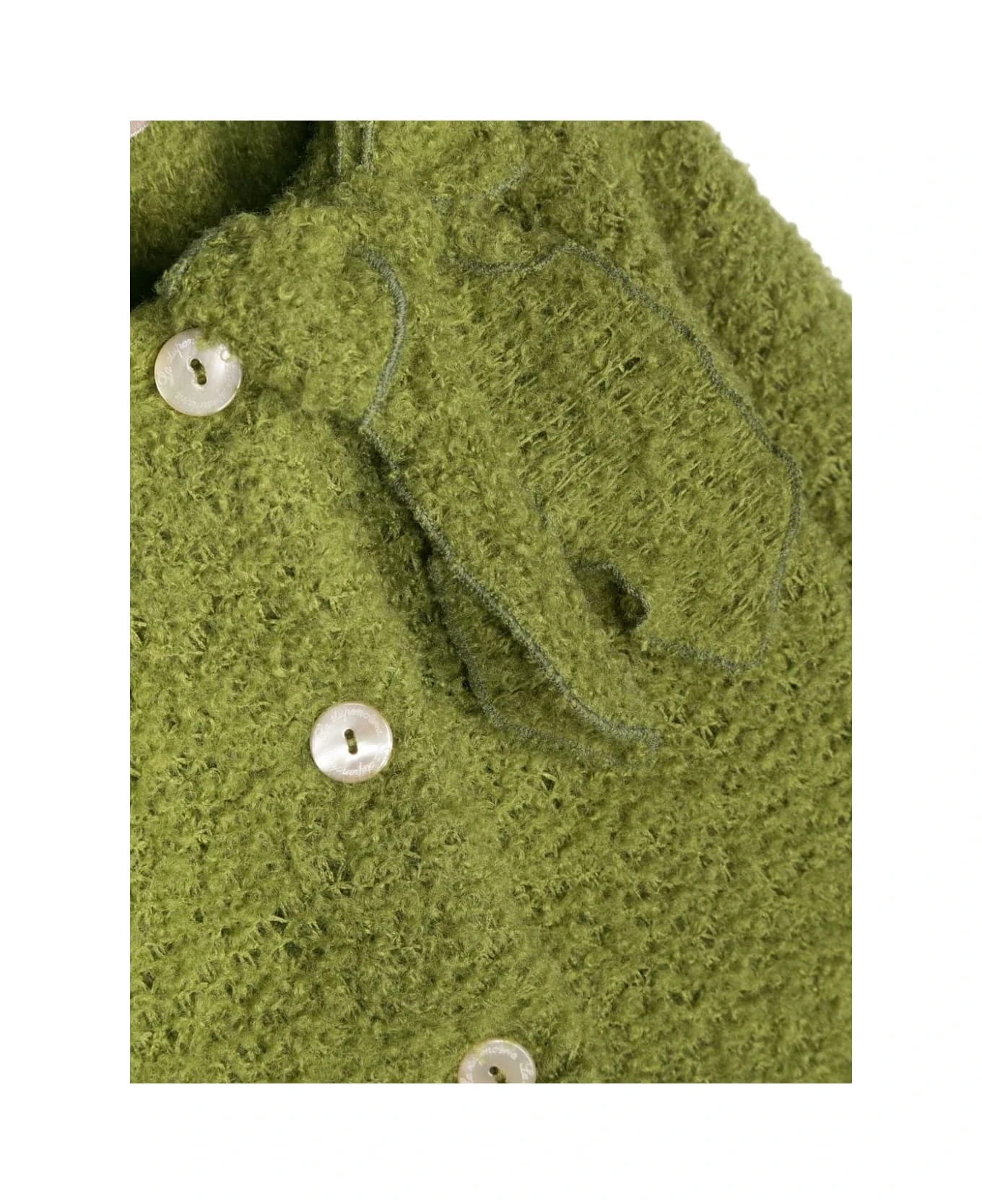 Giacca girocollo con fiocco, chiusura frontale con bottoni, maniche lunghe e polsini risvoltati. Composizione