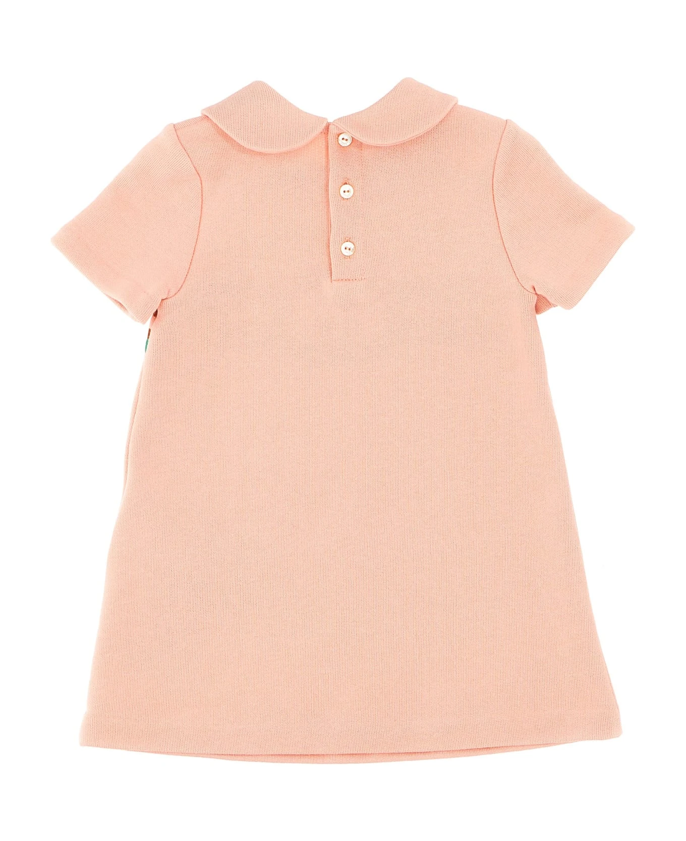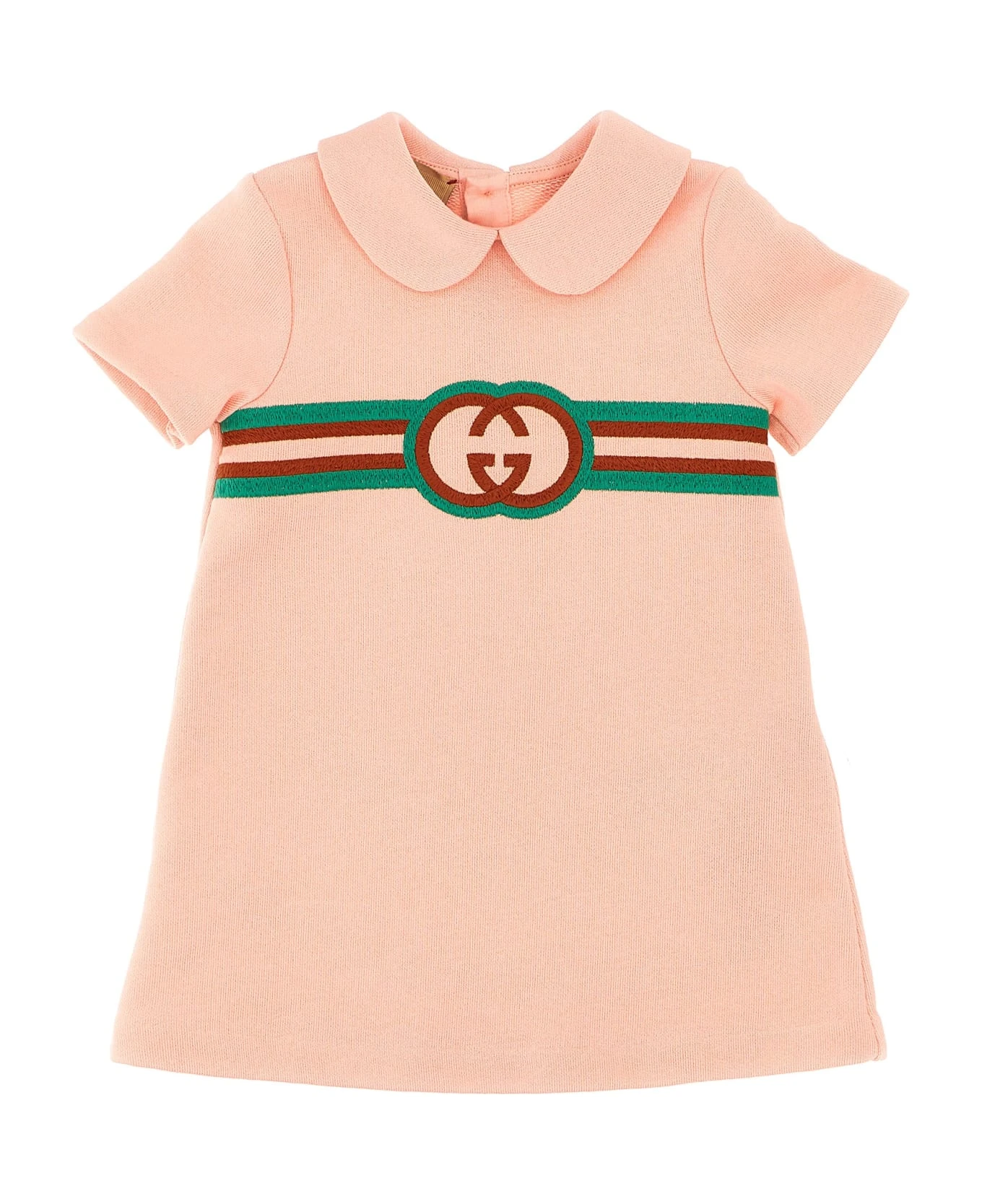 Cotton dress with front embroidered logo, collar, and short sleeves.