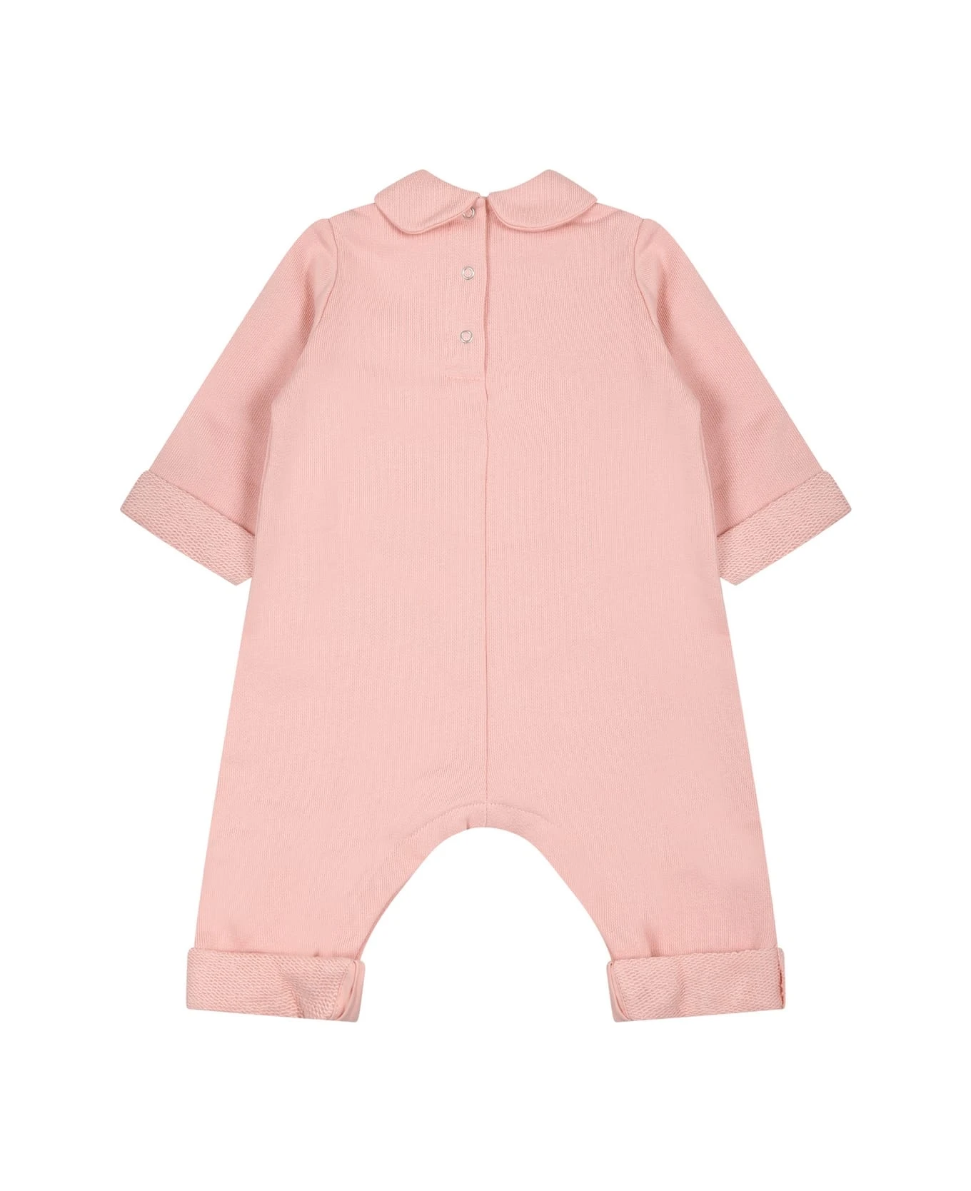 Pink babygrow in brushed cotton, with long sleeves, peter pan collar, closure with automatic buttons on the back and between the legs. It is embellished with iconic logo, multicolor print and stars, on the front. It’s a Gucci Kids x The Jetsons© collaboration.