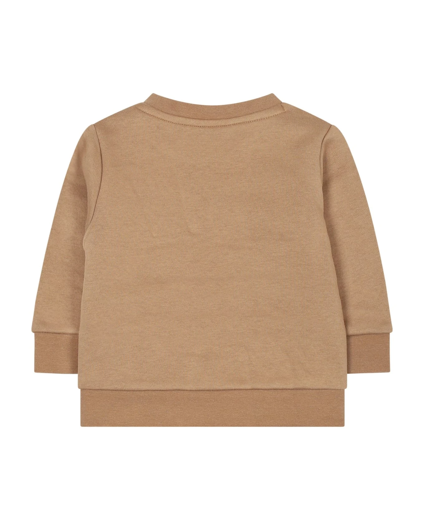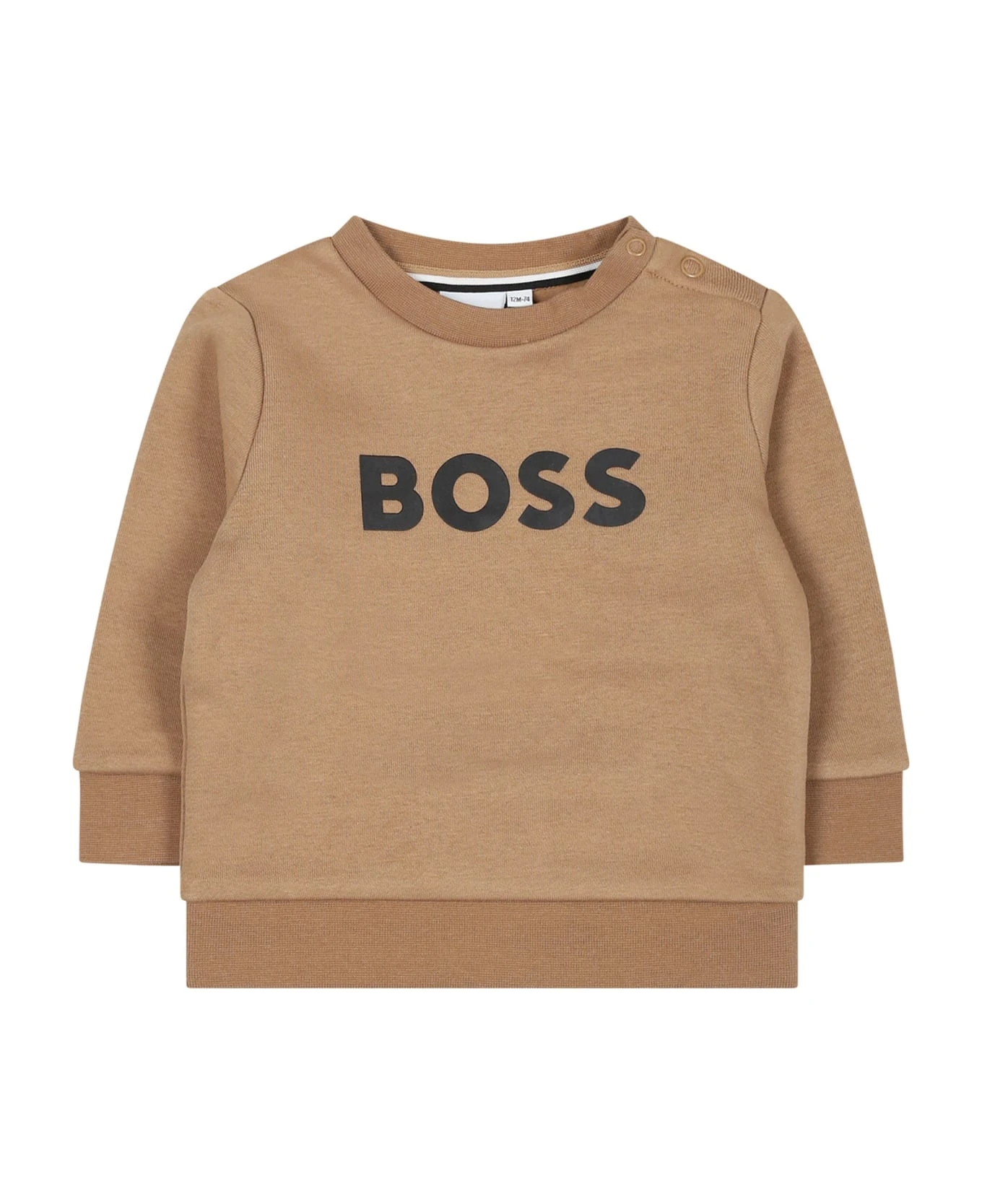 Camel crewneck sweatshirt, made from plush cotton, with long cuffed sleeves, fastner with clip buttons on the shoulder and elastic on the bottom. It is embellished with black logo printed on the front.