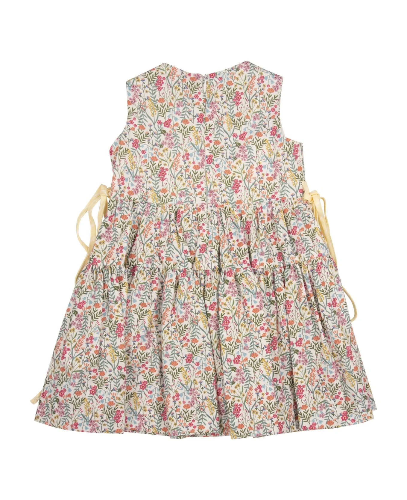 A sleeveless trapeze dress made of 100% organic cotton with a multicoloured flower print on a white base. Practical adjustable side waist ties in shades of yellow and flounces on the skirt that accentuate the volume. Top lined internally in white cotton voile and small concealed zip at the back. Ideal garment for both special occasions and daily looks. – A-line – Sleeveless – Waist ties DESIGNER ID: P23VA308C4097. 536