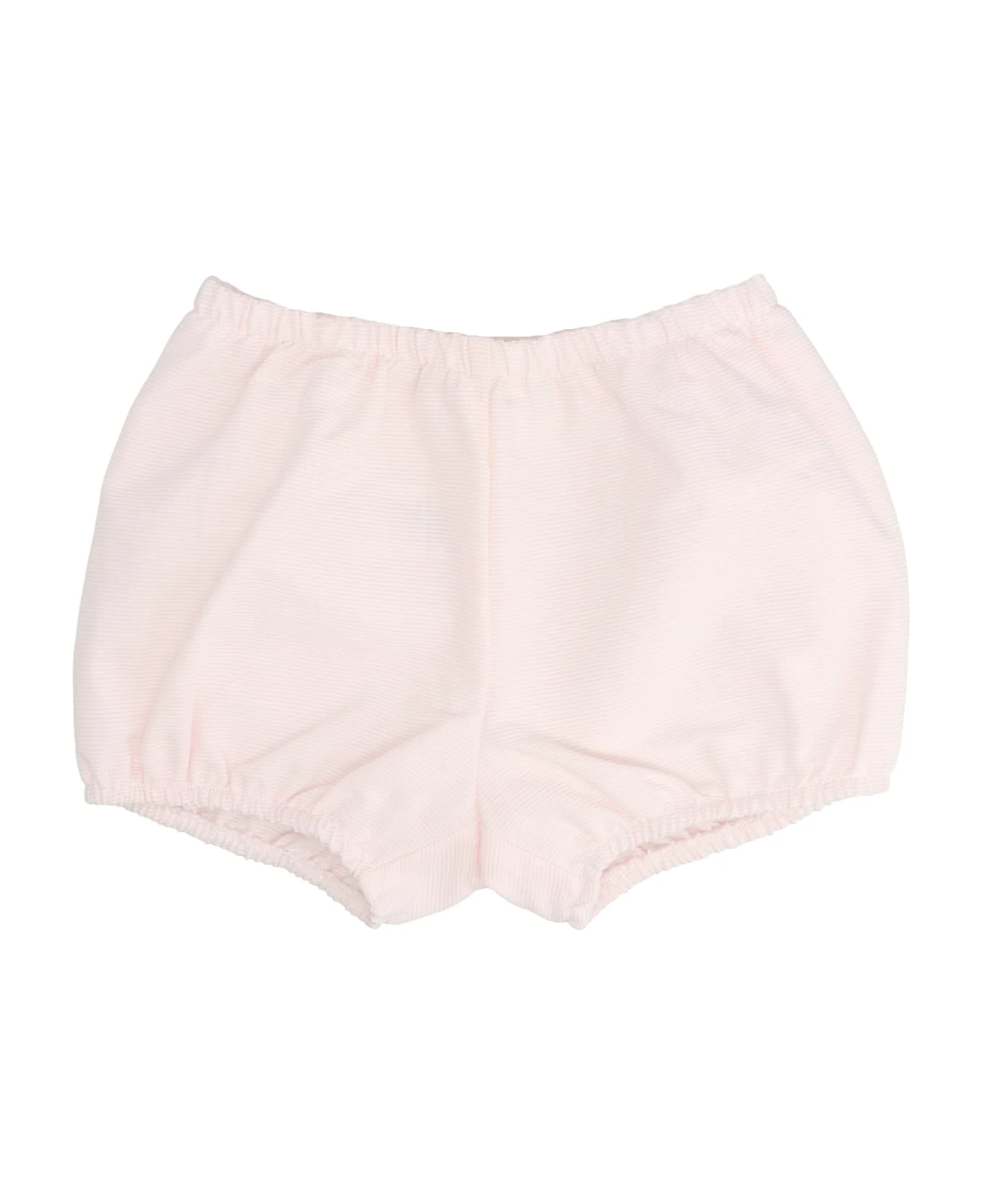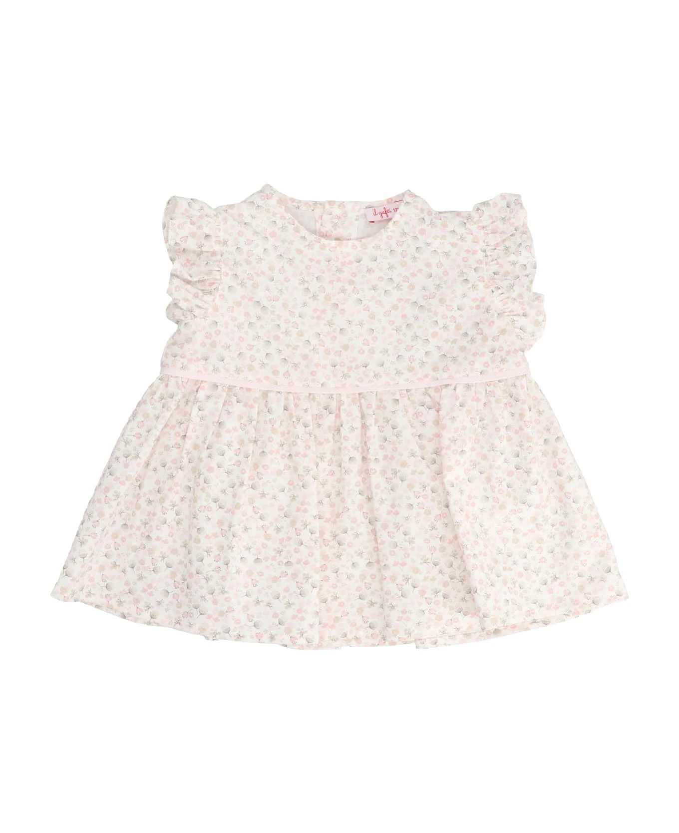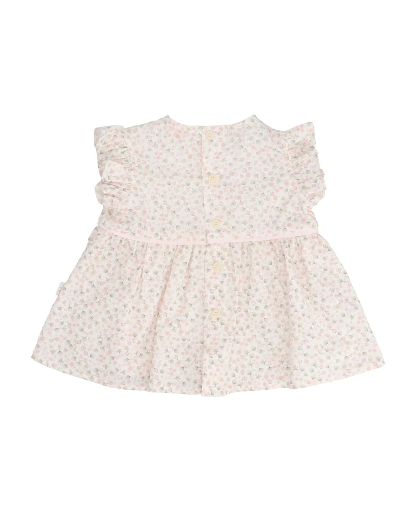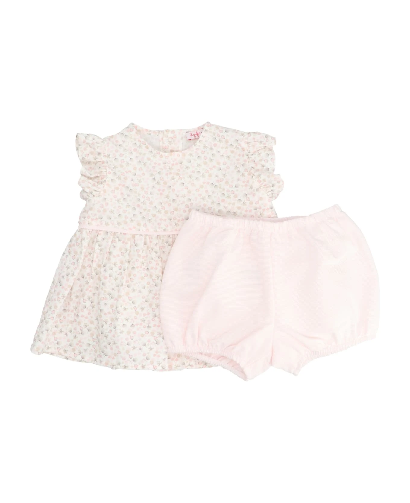 Floral printed cotton dress, with a crew neck, short sleeves with striped culottes and a matching elastic waistband.