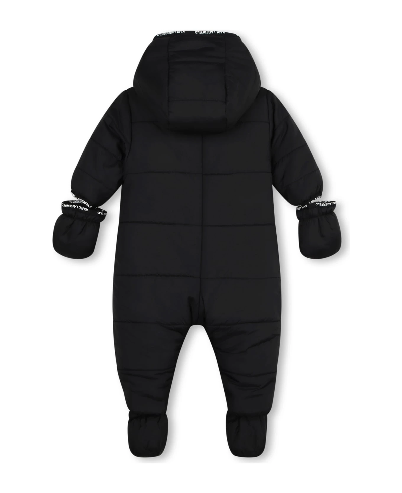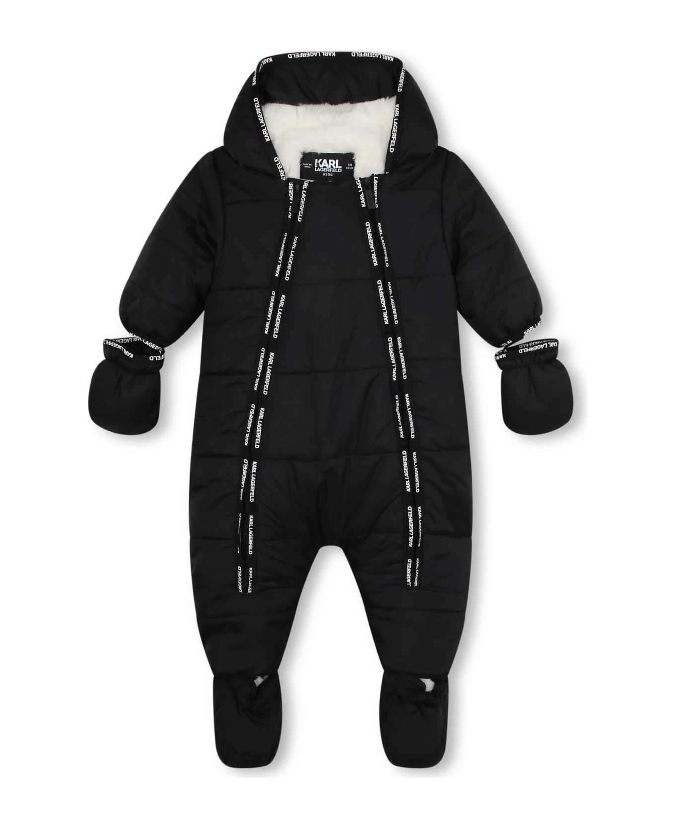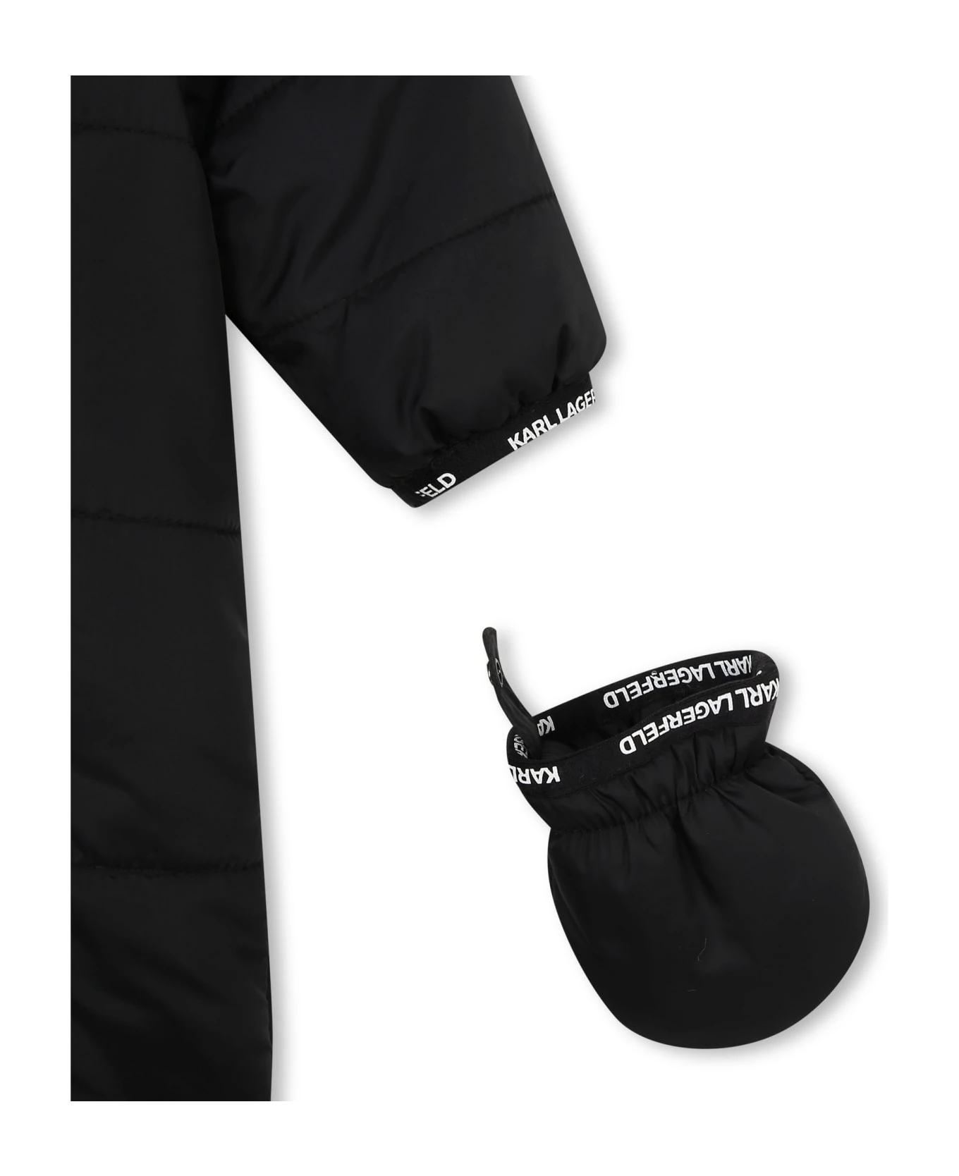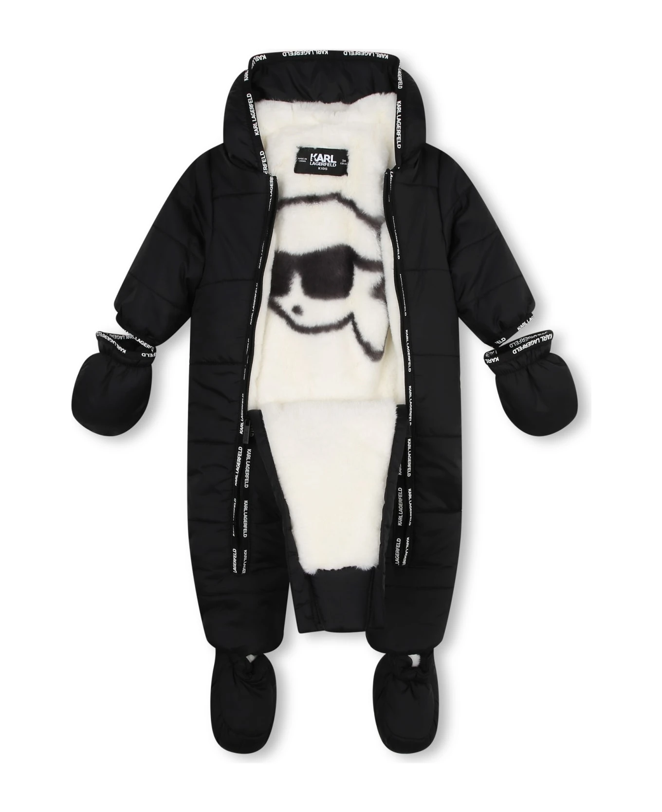 Eskimo con cappuccio, fasce con logo, fodera in shearling, chiusura frontale con zip, maniche con guanti e scarpine. Composizione