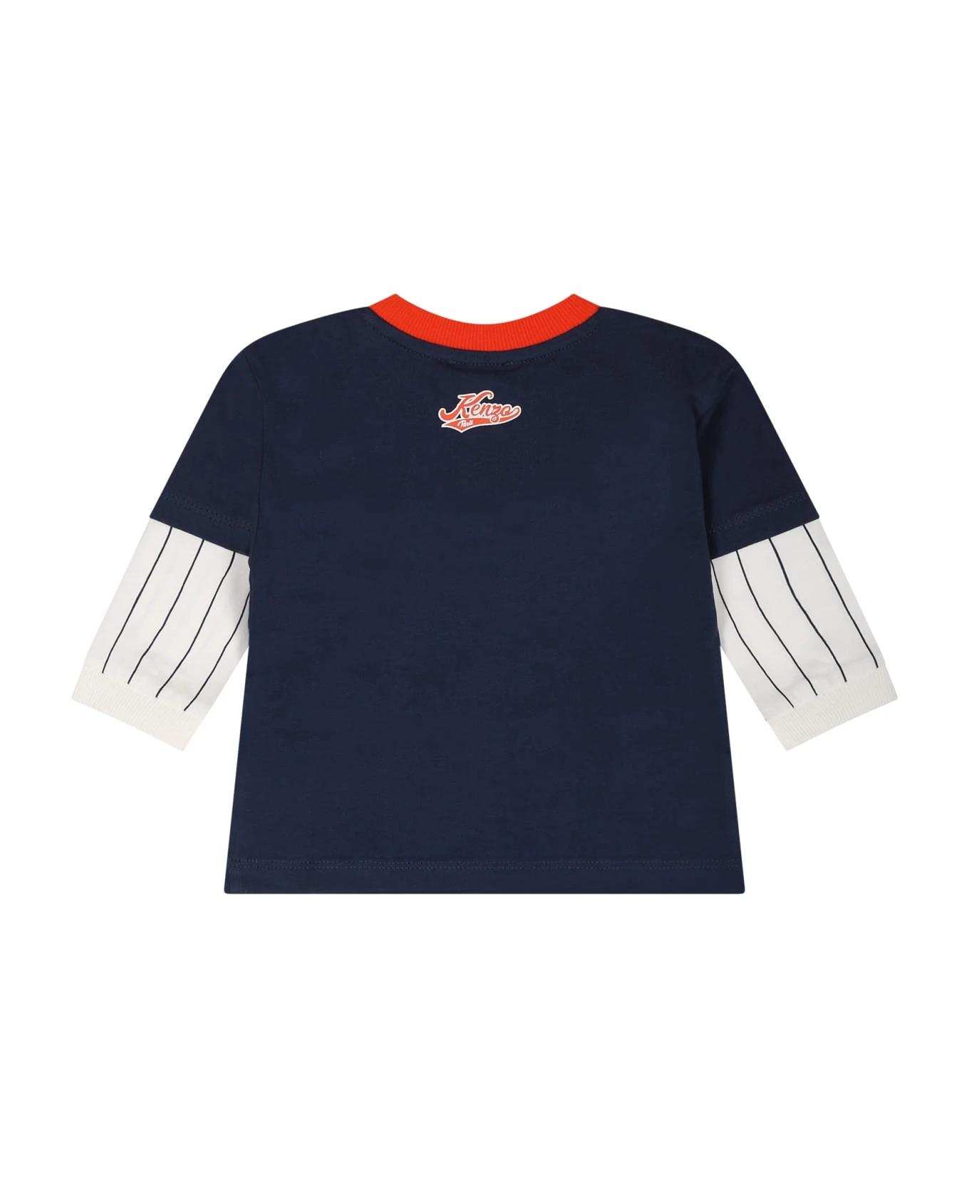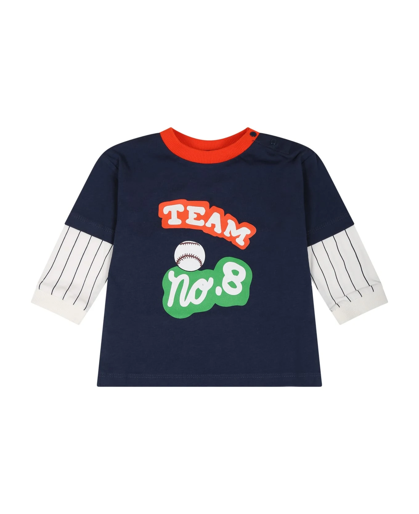 Blue cotton T-shirt, long sleeves, with ribbed crew neck, closure with press studs on the shoulder. It is embellished with “Team no. 8” writing and print, on the front.
