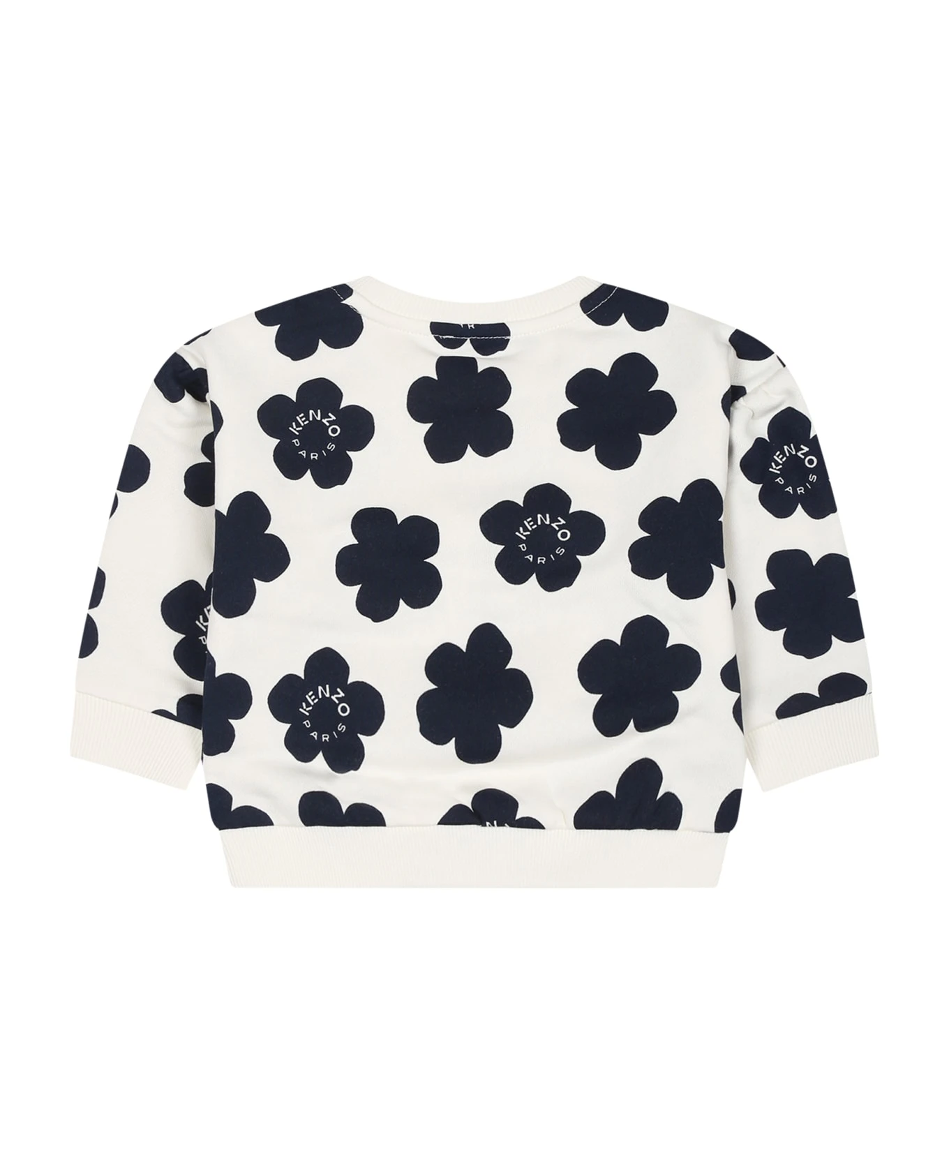 Ivory sweatshirt in cotton fleece, with long sleeves, with ribbed crew neck, hem and cuffs and closure with press studs on the shoulder. It is embellished with all-over flowers and logo.