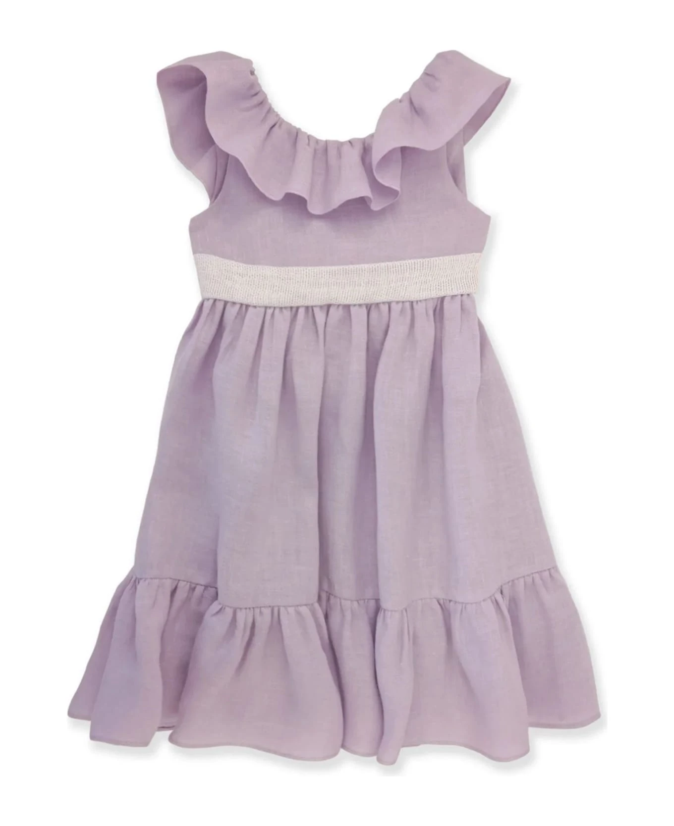 Light lilac linen unlined dress with white cotton sash, ruffle collar and back neckline