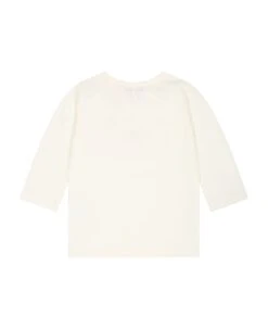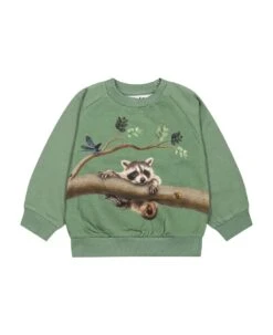 Green sweatshirt in GOTS certified brushed cotton, with long sleeves, crew neck, ribbed cuffs and hem, button closure on the shoulder. It is embellished with animals and plants on the front.