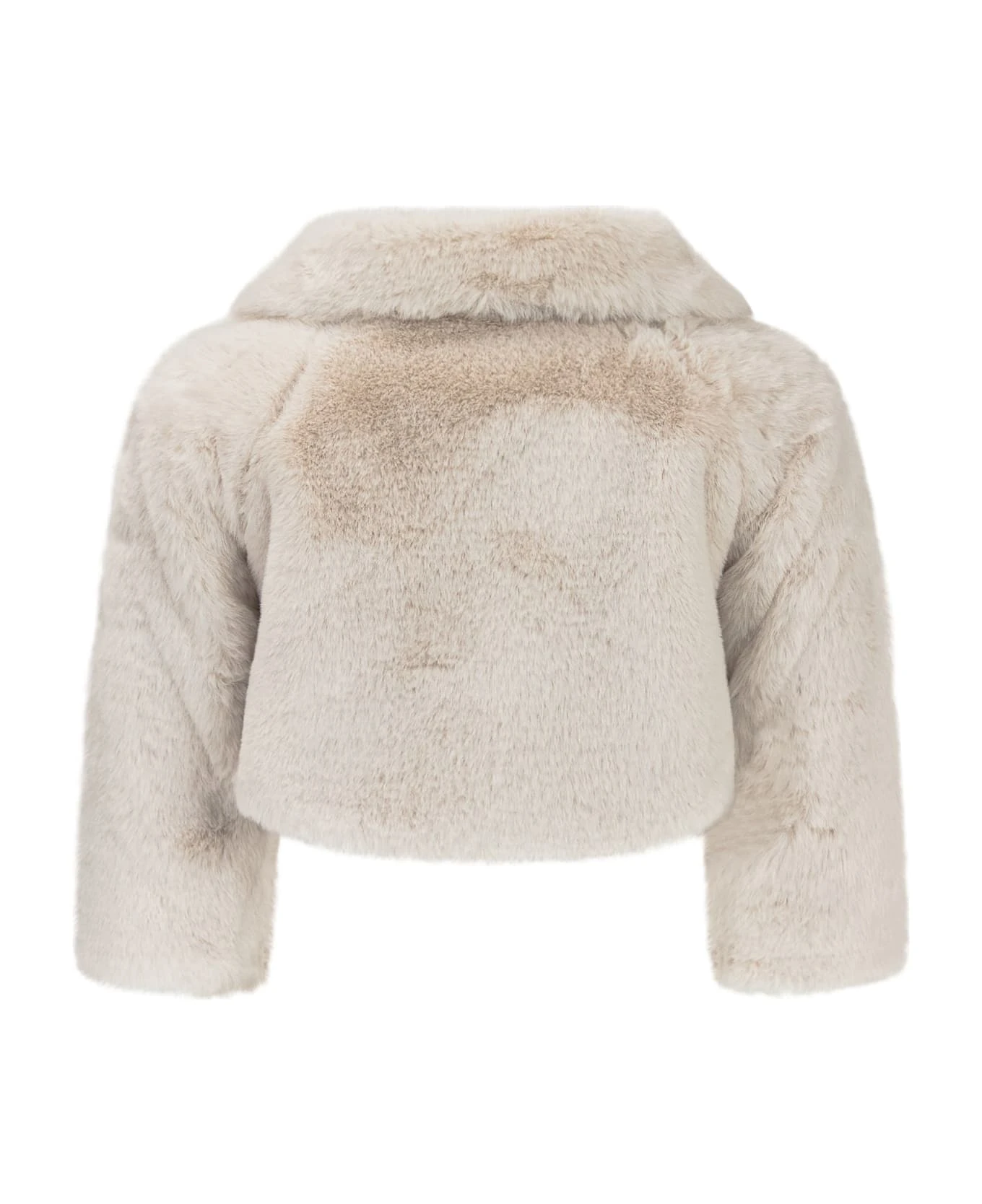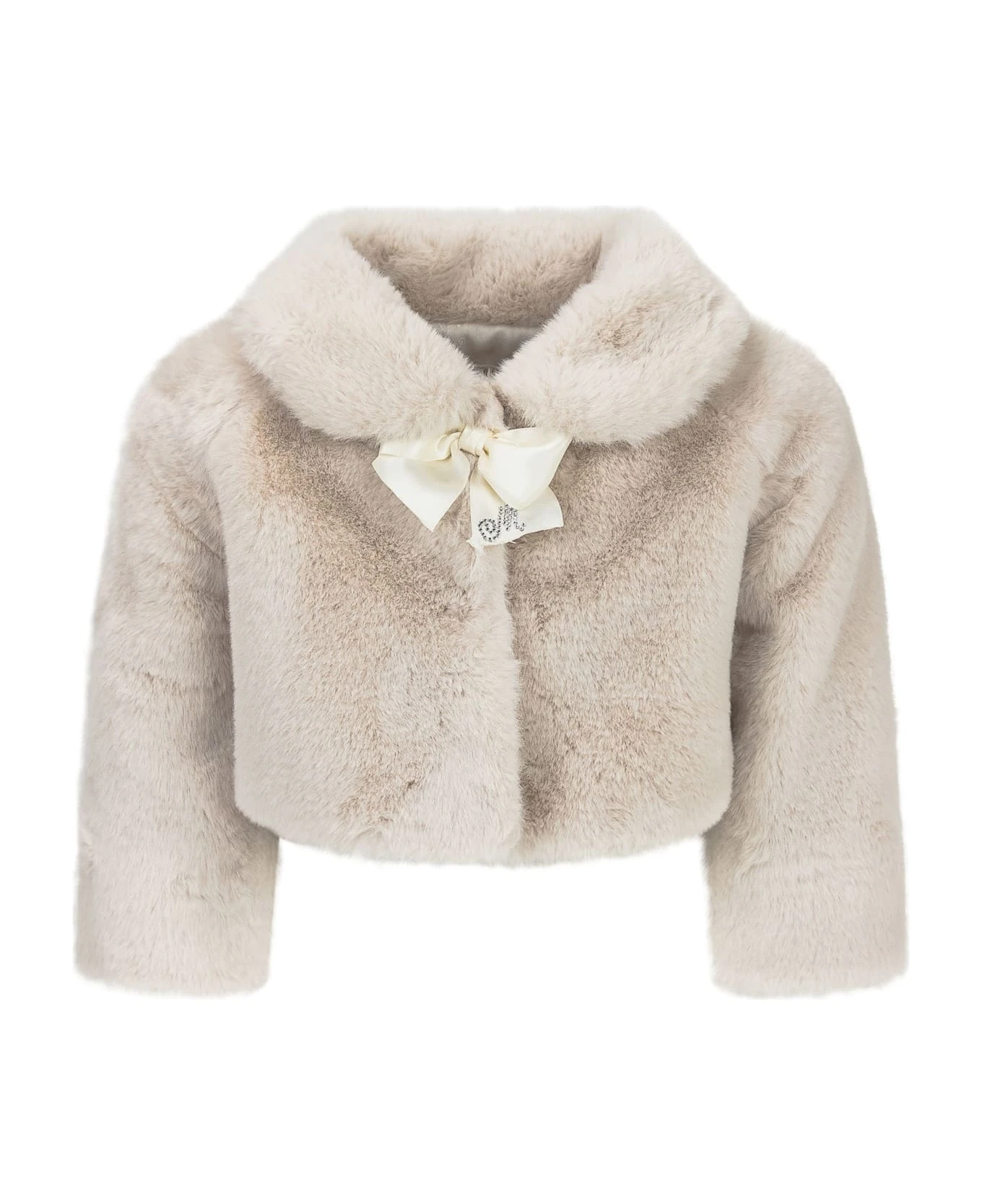 Fur jacket with long sleeves. V-neck. Bow detail with rhinestone logo on the front.