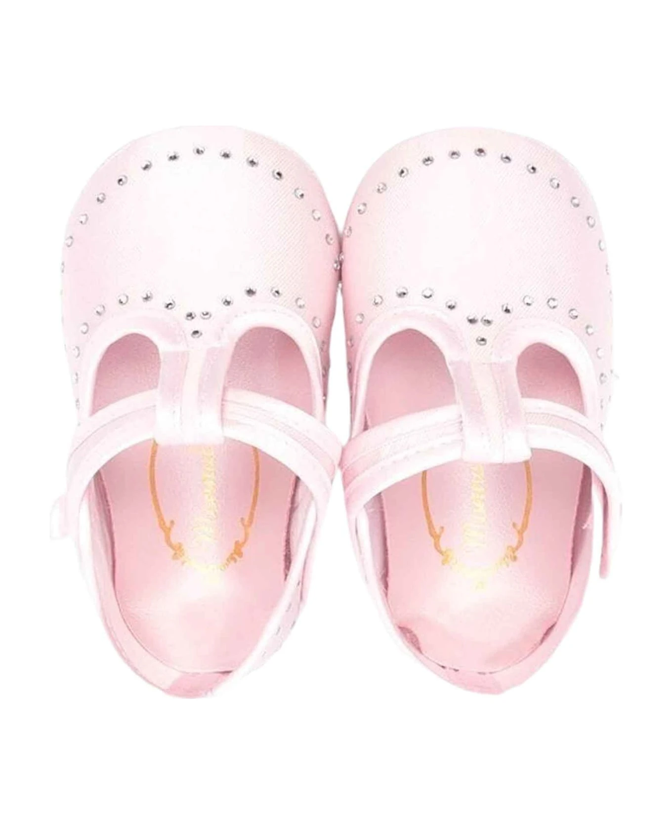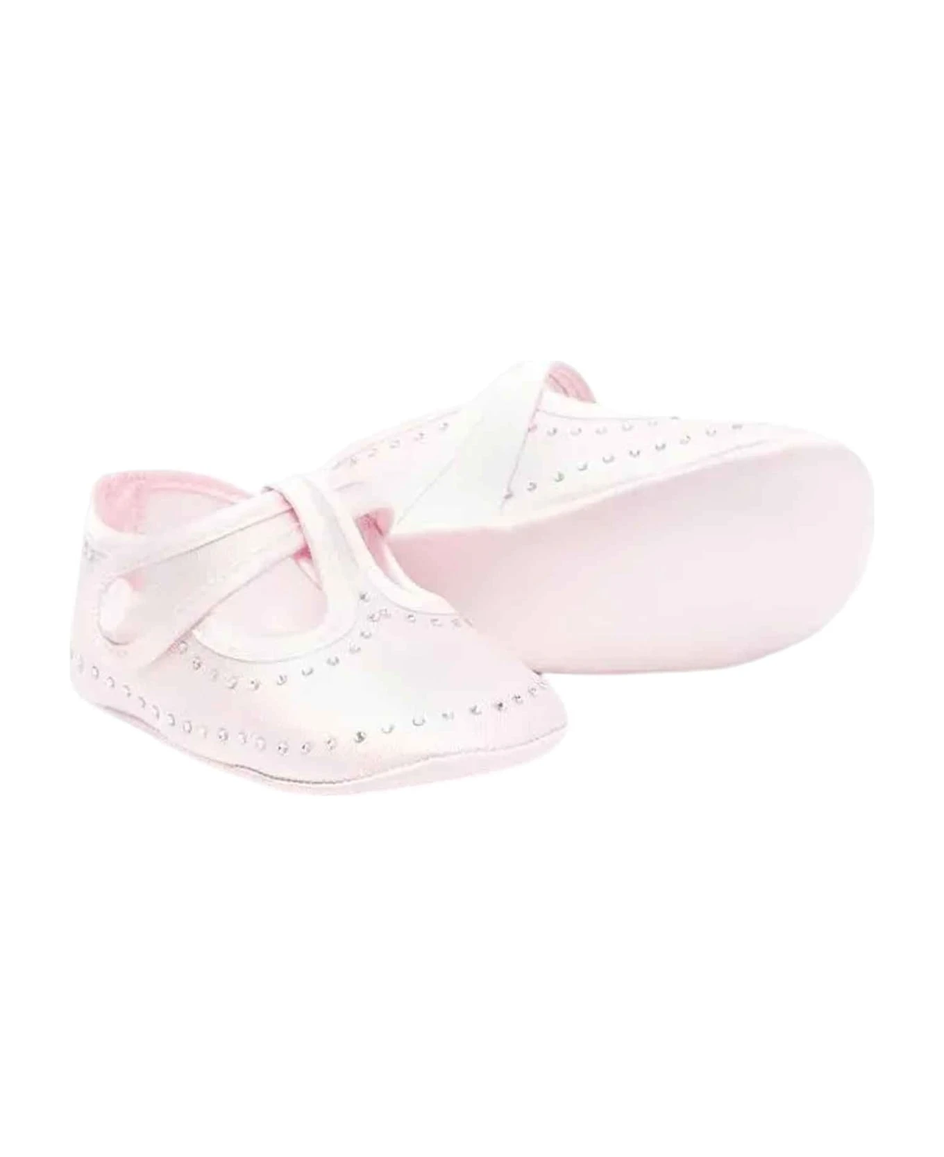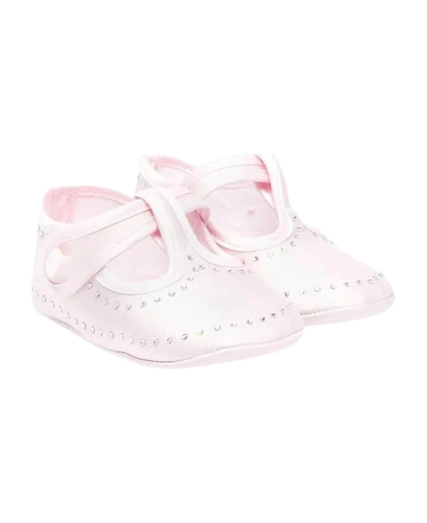Pink ballet flats baby girl. Embellished with rhinestones, T-bar fastening, front hook and loop closure, round toe and flat sole. Fabric 100%, Calf Leather 100%
