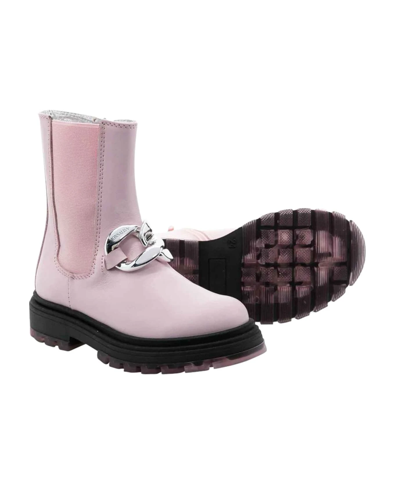 pink boots girl Monnalisa. Detail with chain, side elastic panels, round toe, insole with logo and non-slip sole. 100% leather