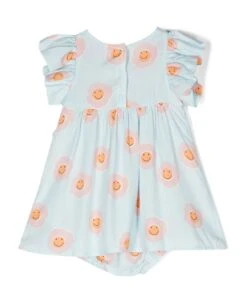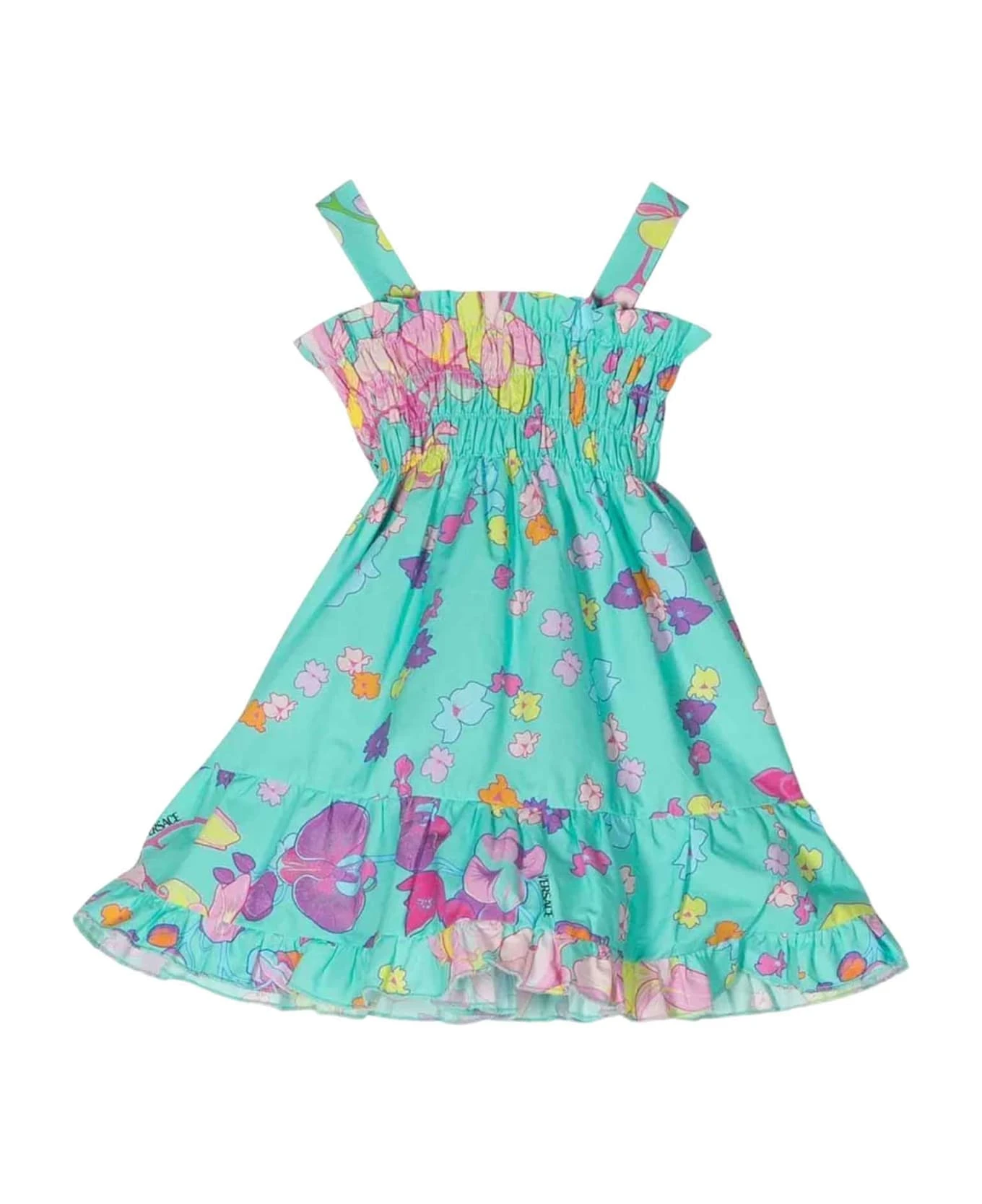 multicolor dress girl kids. Floral print, thin shoulder straps, stretch panel with honeycomb design, metal eyelet detail, sleeveless and ruched hem. 100% Cotton