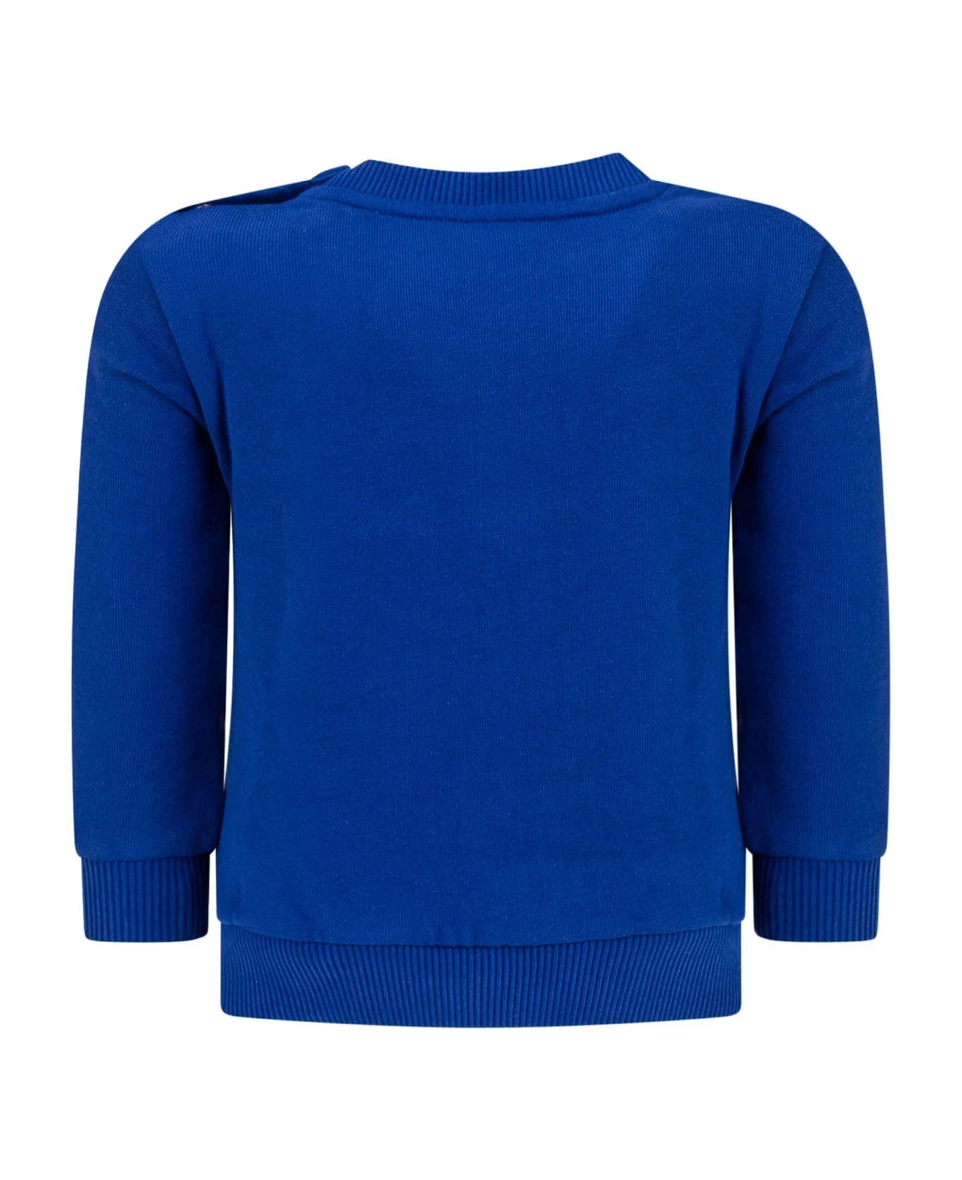 Jumpsuit set. Blue long sleeve sweatshirt. Crew neck. Embroidered logo on the chest. Closure on the shoulder with buttons. Ribbed collar, cuffs and bottom. Long pants. Elastic waist. Embroidered logo.