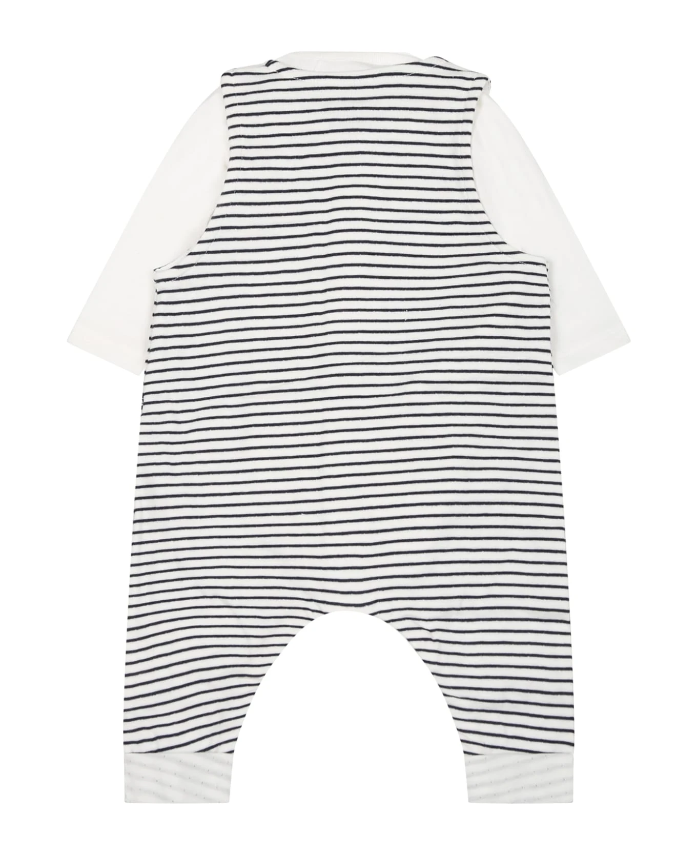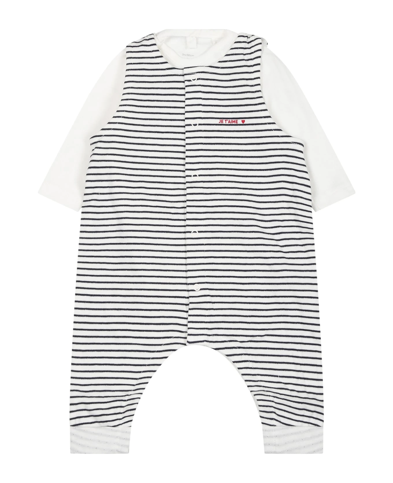 Multicolor set in Oeko-Tex certified cotton composed of dungarees and body. Multicolor dungarees in Oeko-Tex certified cotton, closure with snap buttons on the front. It si embellishe dwith blue lines and the red write “Je t’aime” with red heart. White body with long sleeves, crew- neck, ribbed hem and cuffs, closure with snap buttons.