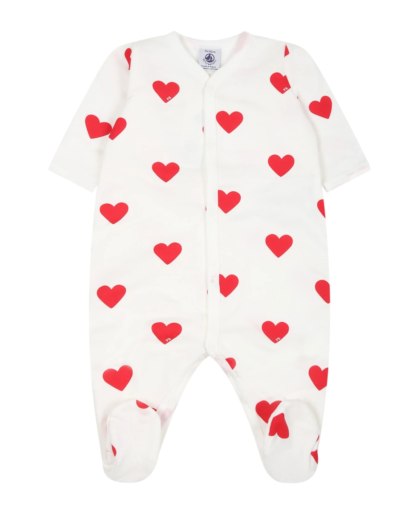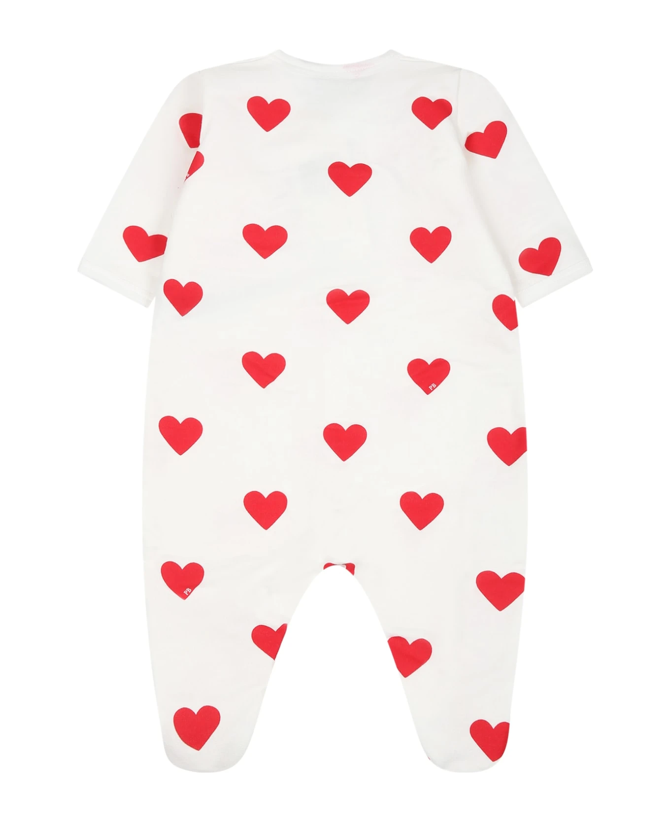 White babygrow in Oeko-Tex certified cotton, long sleeves, ribbed crew-neck, hem and sleeves, snap button closure on the front and between the legs, feet. It is embellished with red hearts all-over.