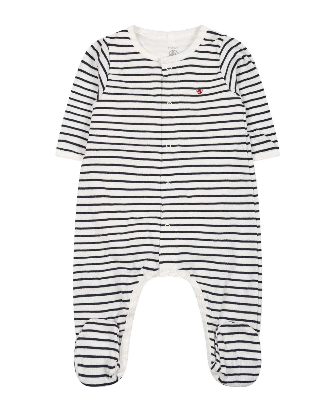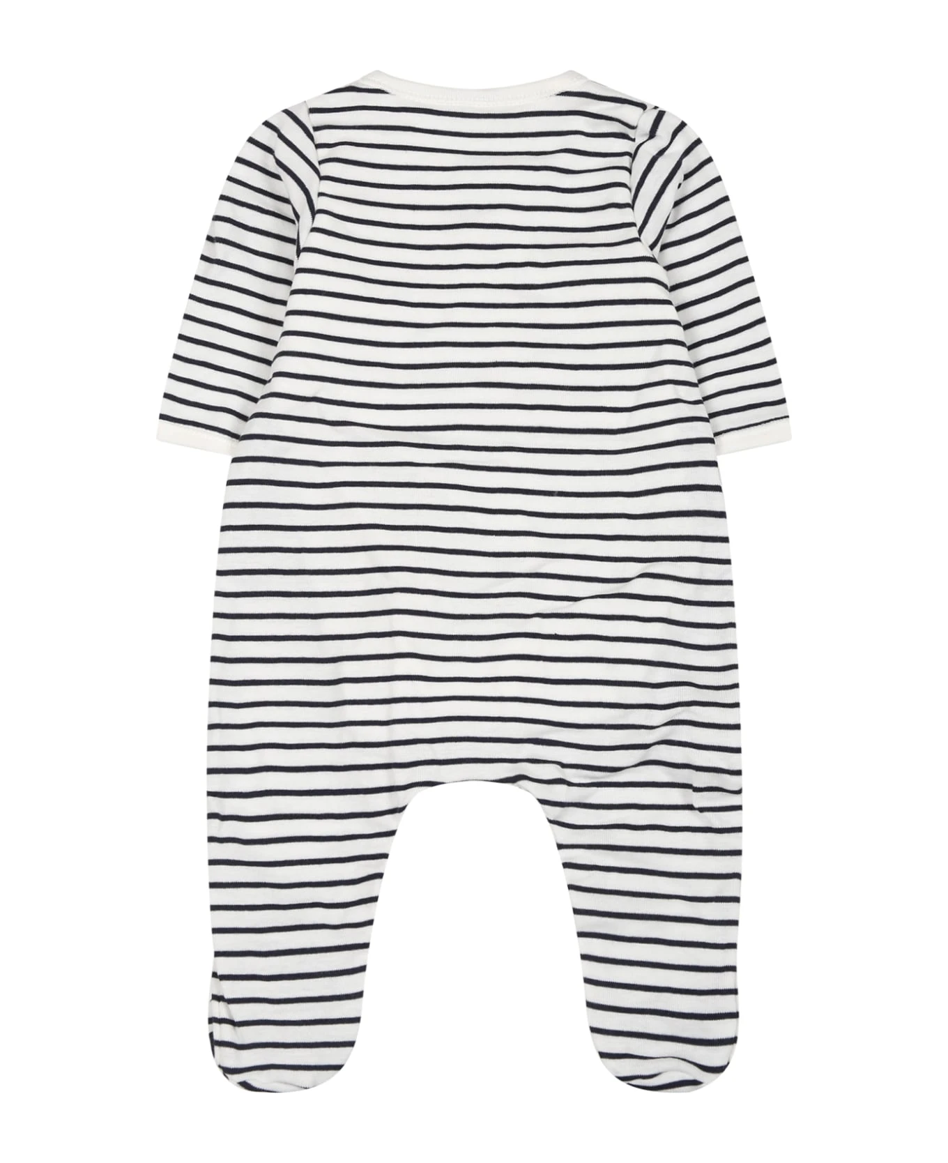 White babygrow in Oeko-Tex certified cotton, short sleeves, ribbed crew-neck, hem and sleeves, snap button closure on the front and between the legs, feet. It is embellished with lines.