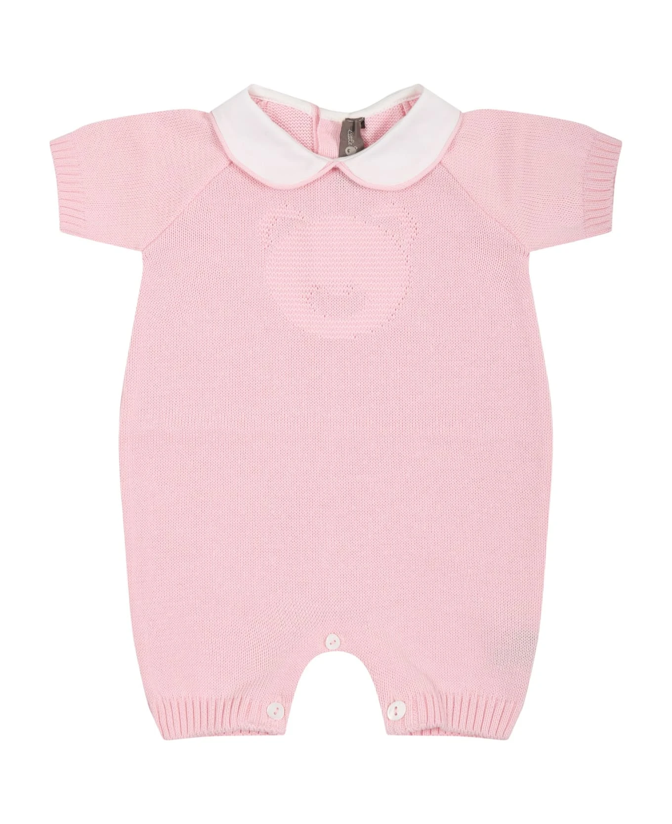 Pink romper, in cotton, with short sleeves, peter pan collar, button closure on the back and between the legs. It is embellished with embroidered bear on the front.