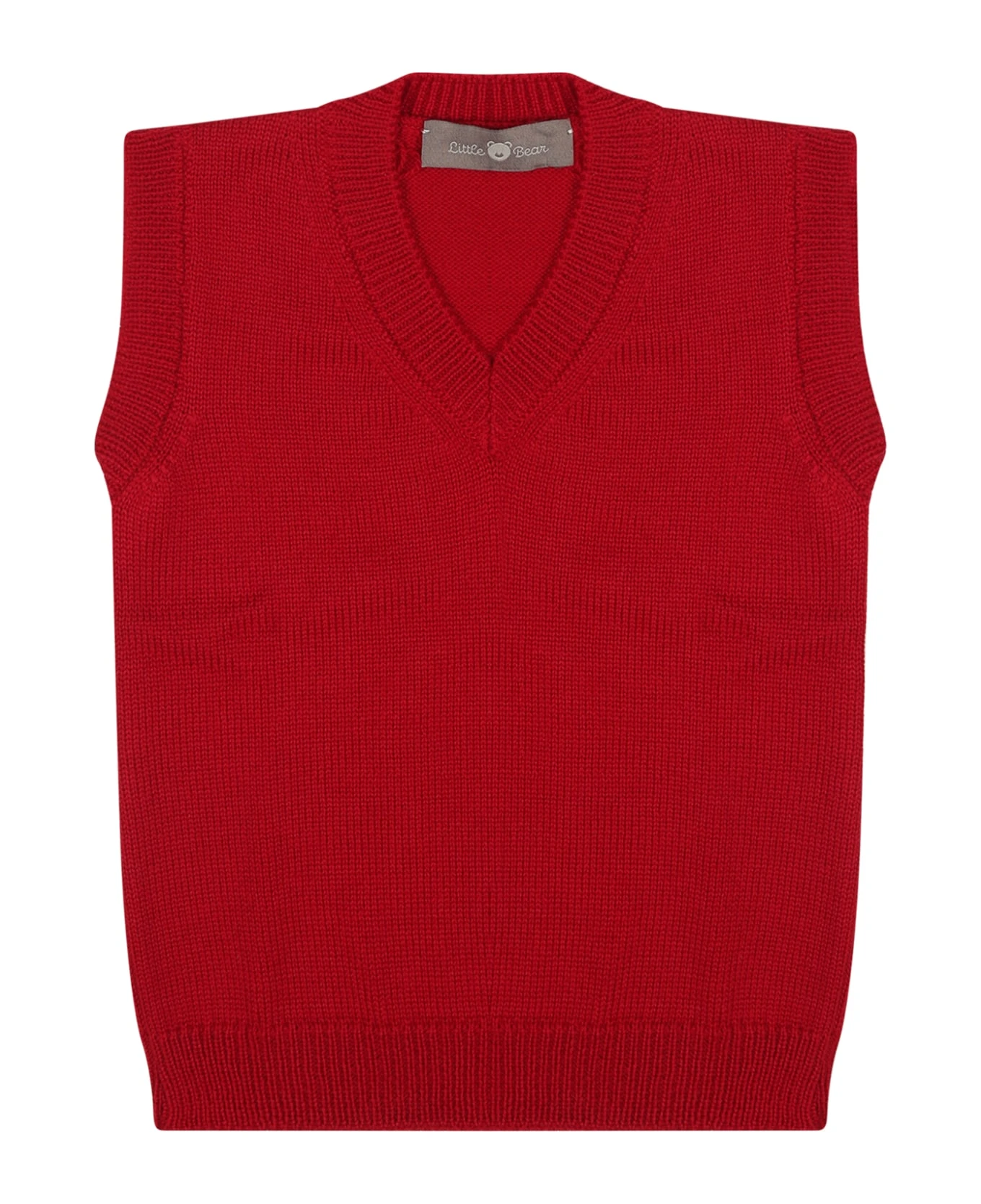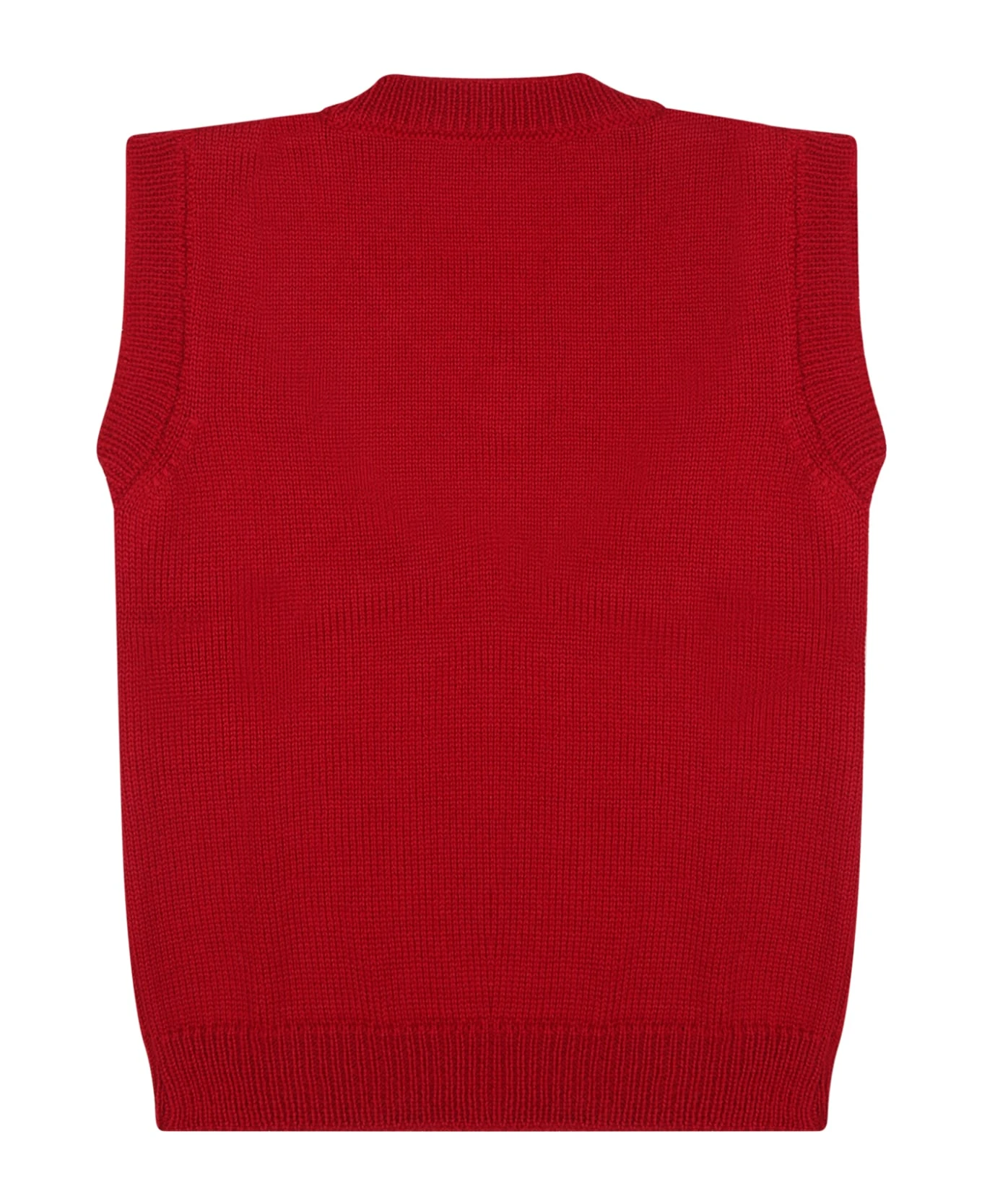 Red wool vest sweater, with V-neck, ribbed armholes and hem.