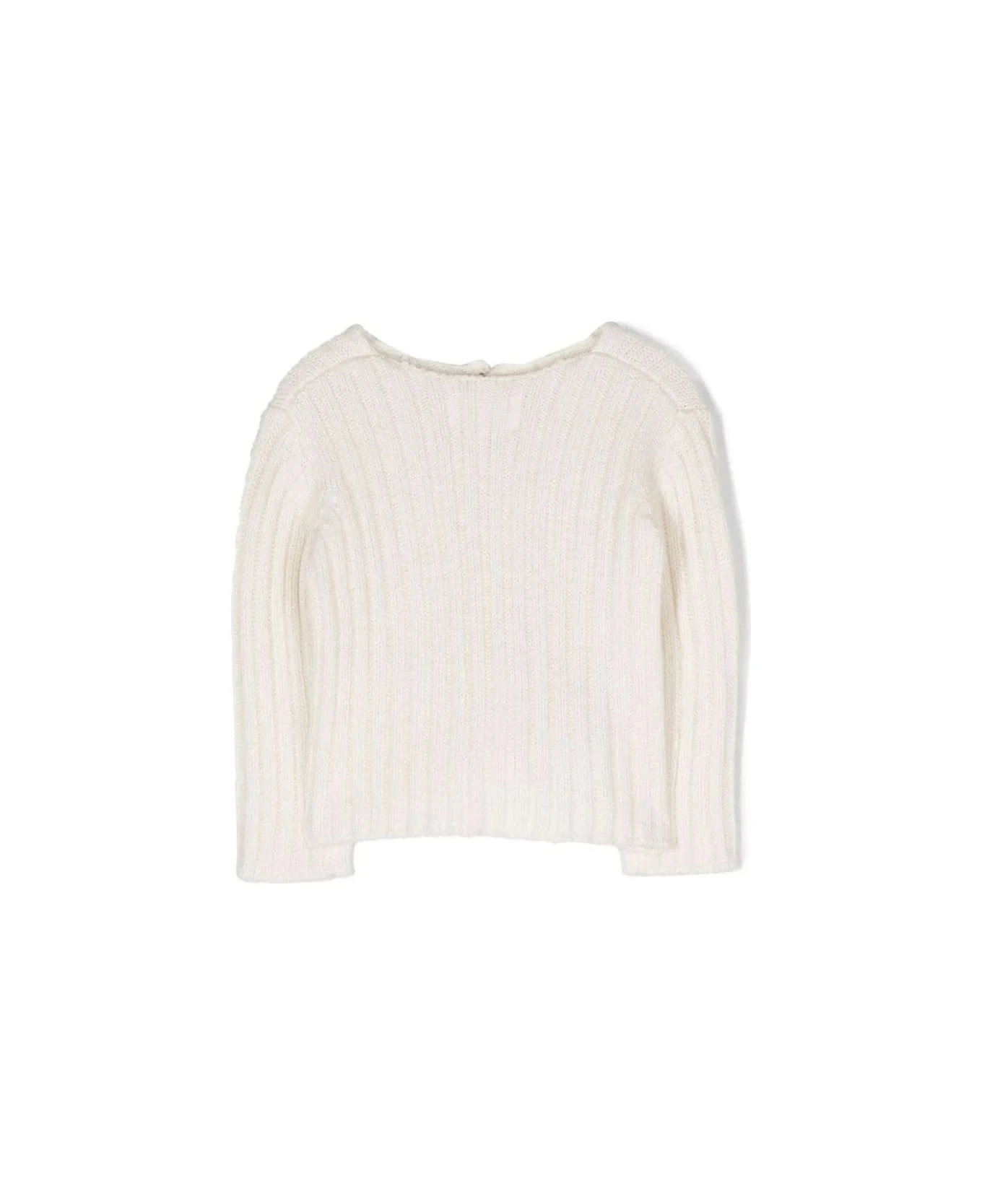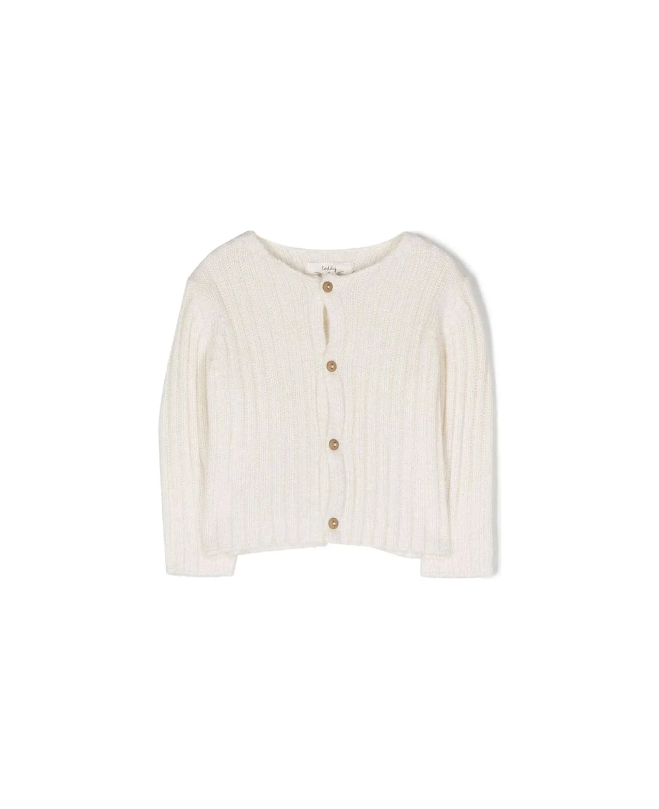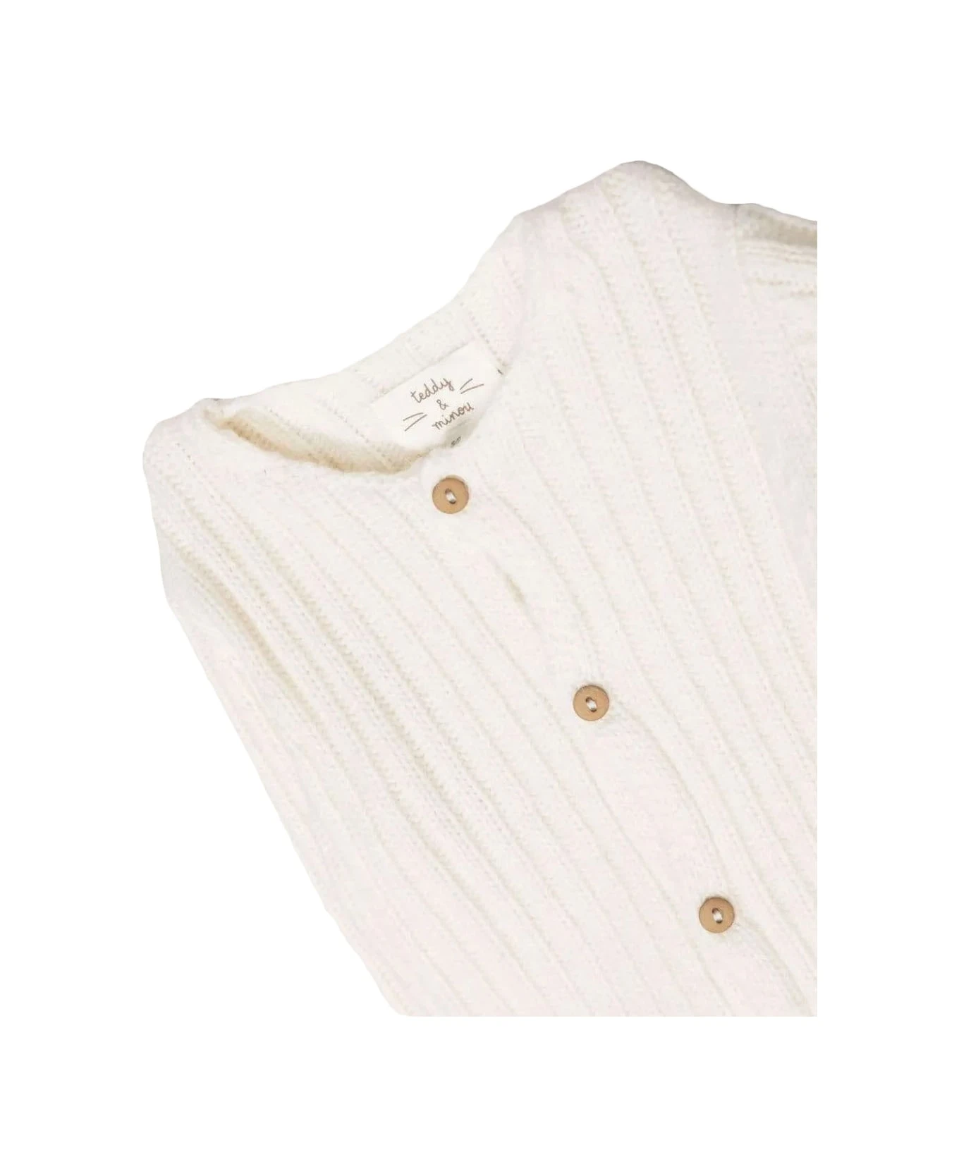 Teddy&Minou cardigan made of sand-coloured wool blend knit with a ribbed knit. The garment features a round neckline, long sleeves and a front fastening with contrasting buttons.