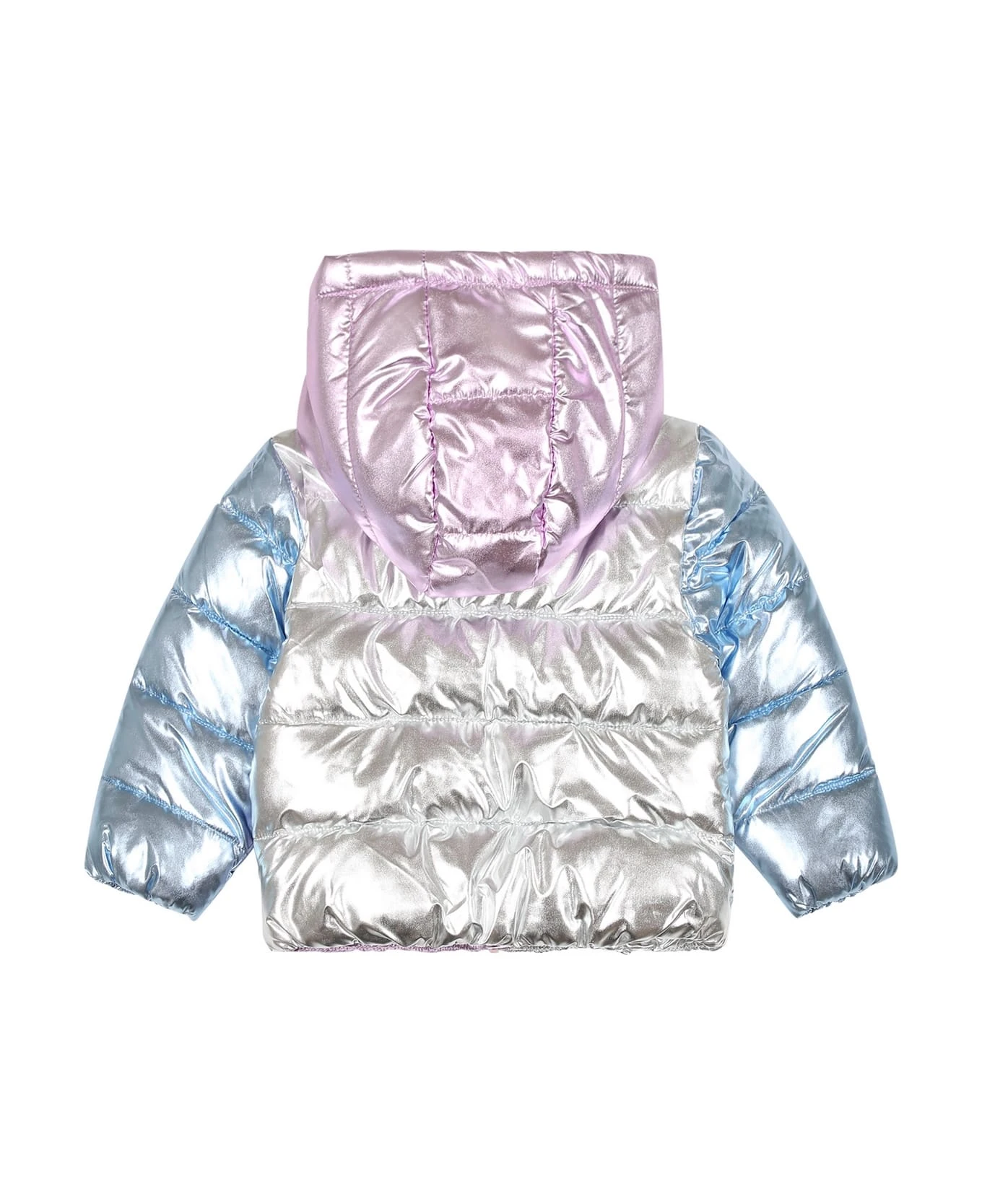 Multicolor padded and quilted down jacket, with hood, long sleeves, side pockets with closure with zip, closure with zip on the front. It s embellished with color block all-over.