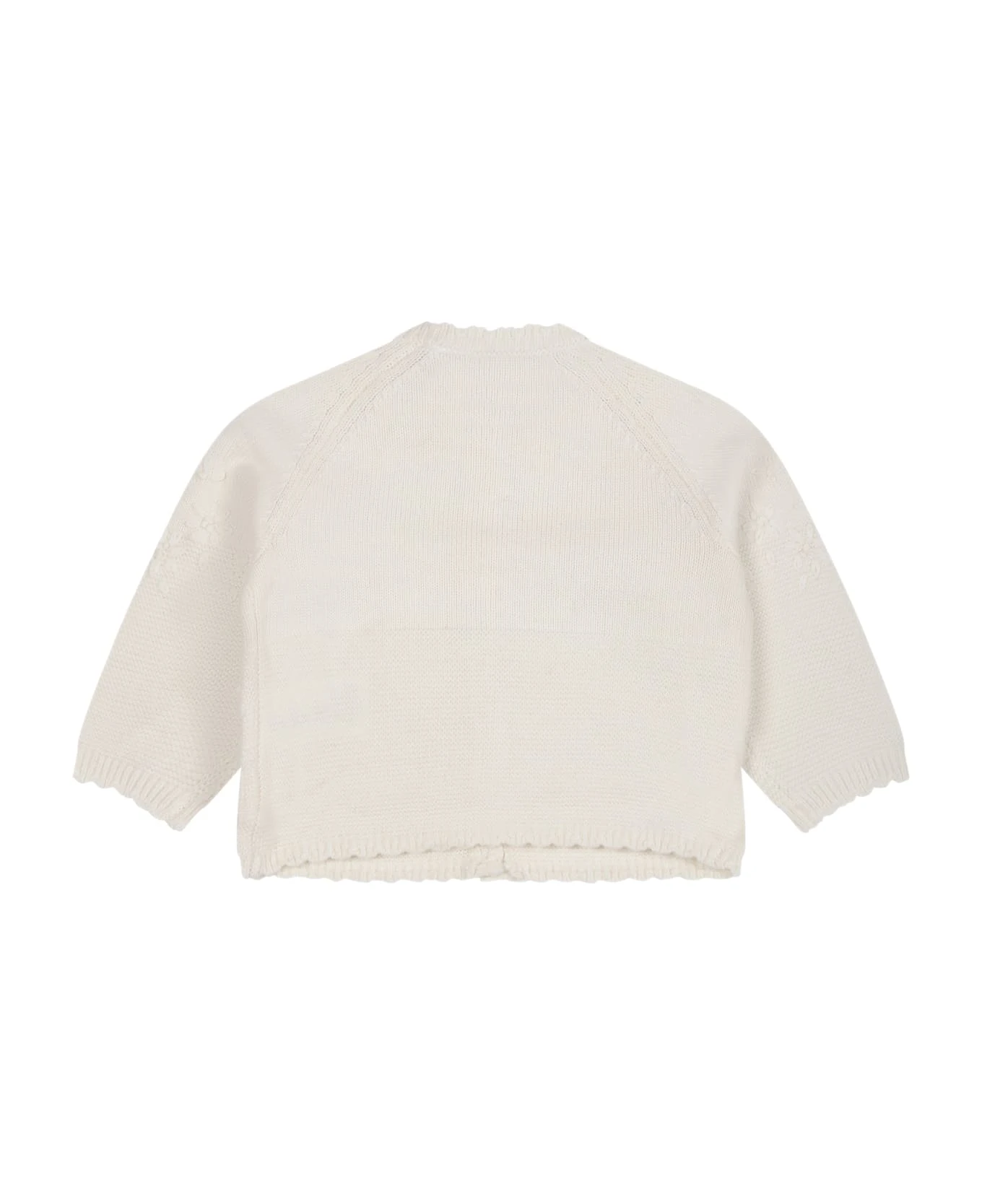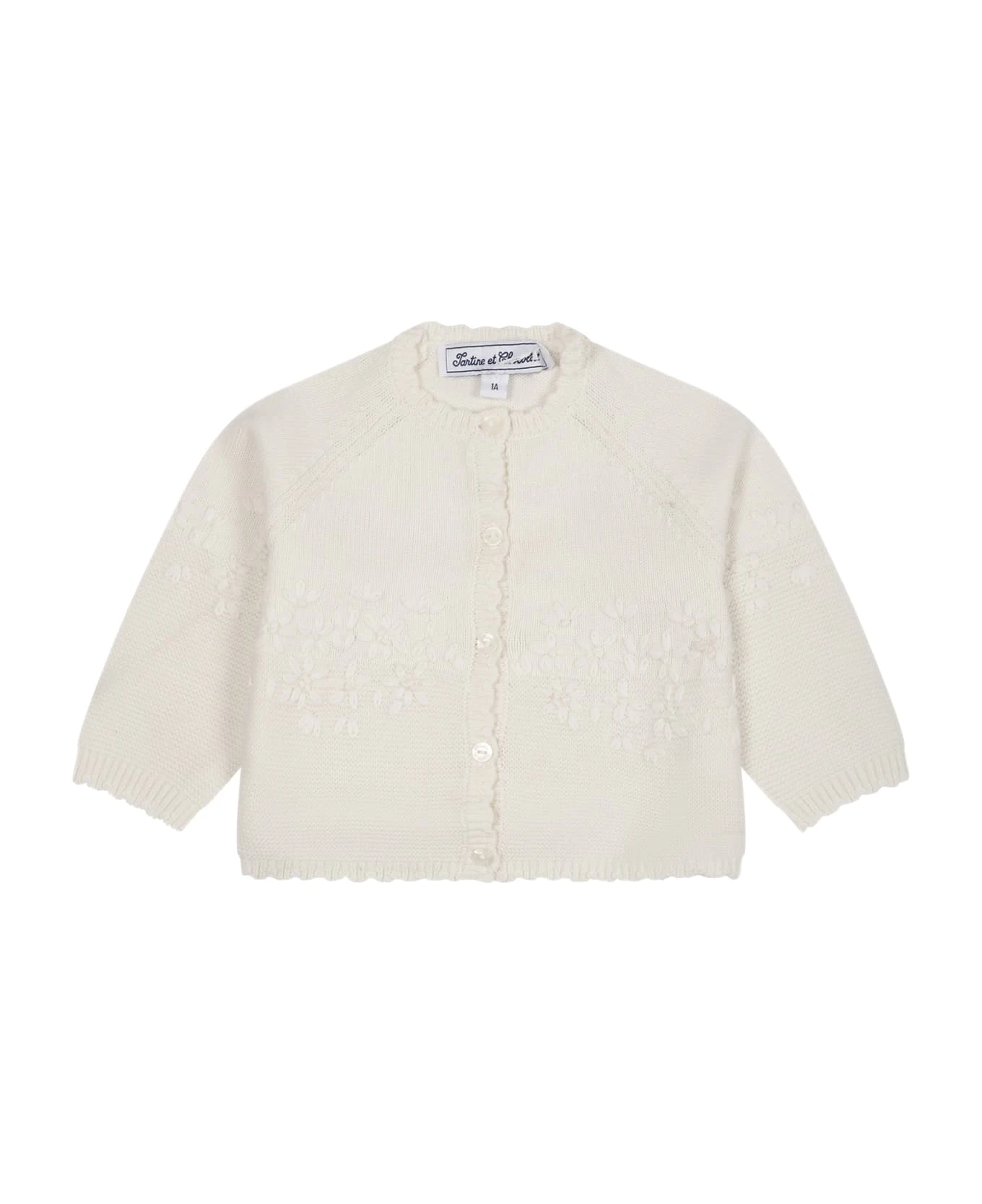 Ivory cardigan in wool and cotton blend, with long sleeves, with ribbed crew neck, cuffs and hem, front closure with buttons. It is embellished with embroidered flowers on the front and on the sleeves.