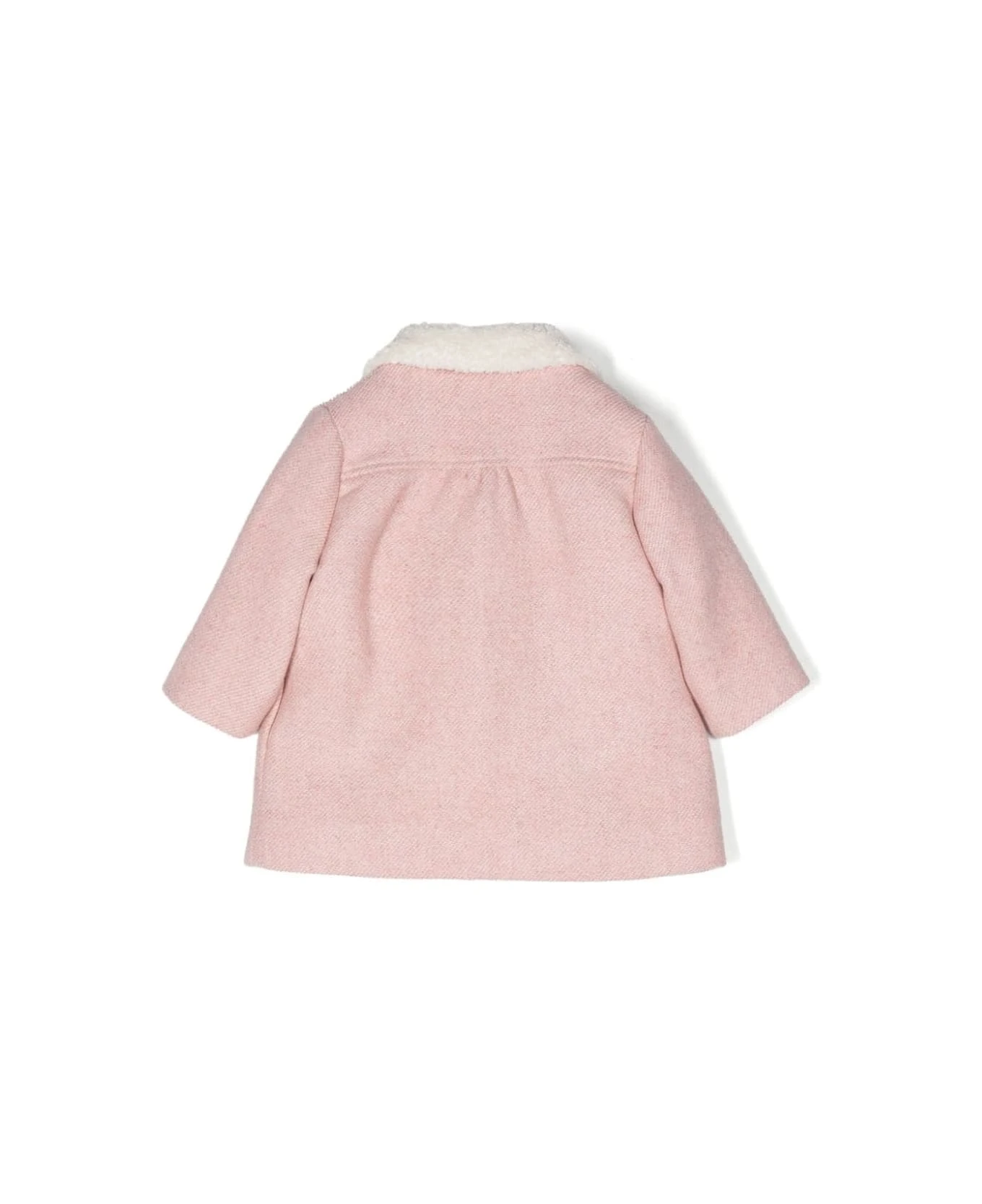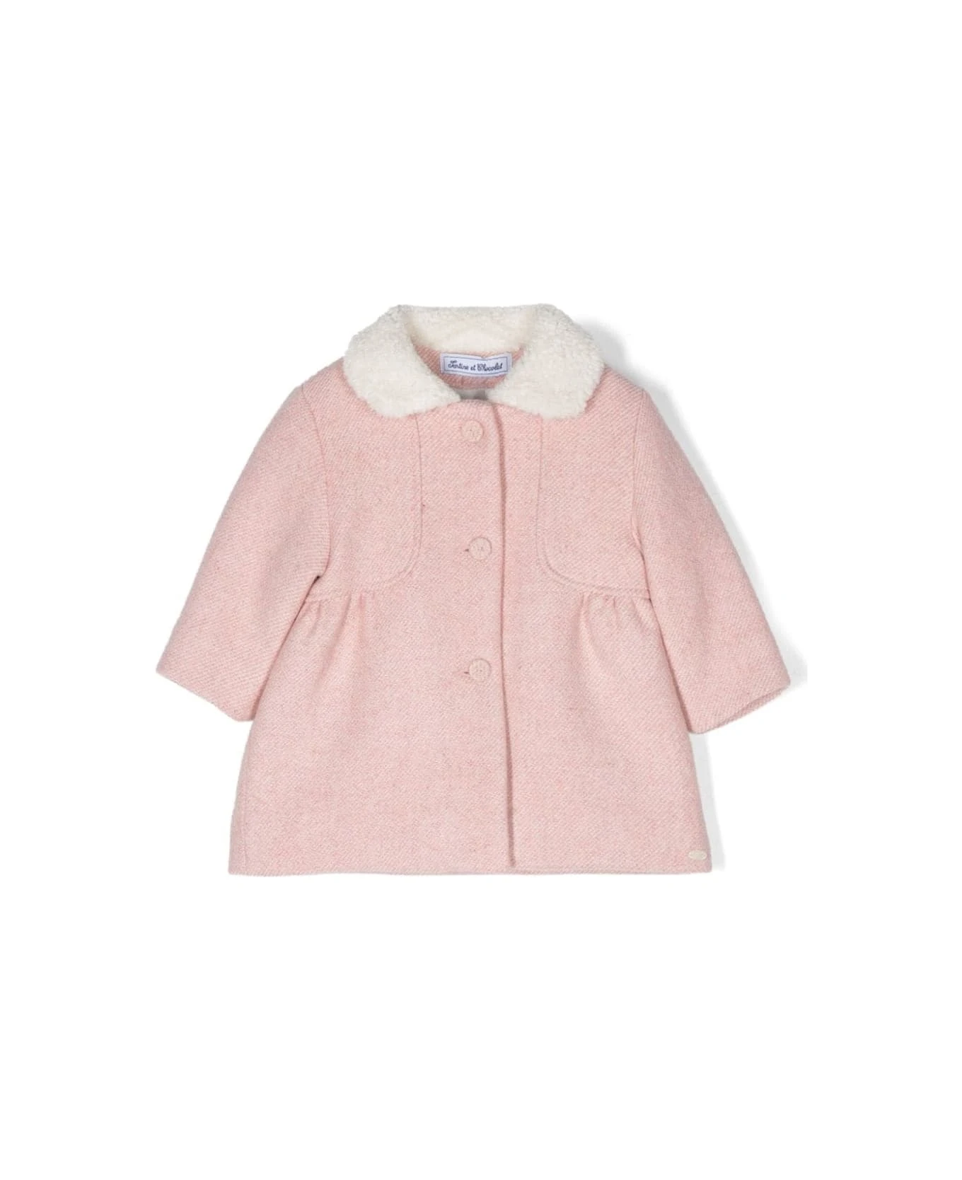 Light pink, dart detail, round collar, front button closure and long sleeves. Composition