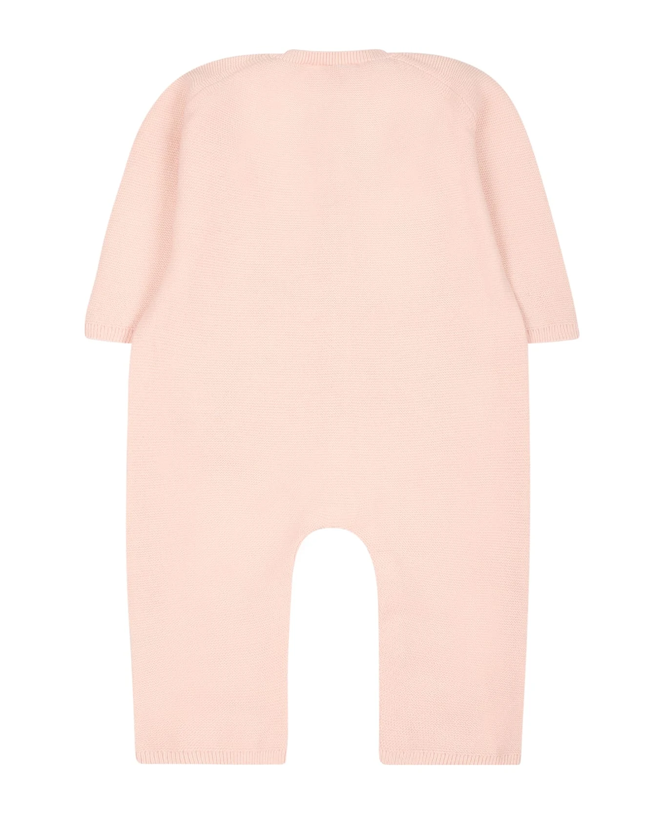 Pink babygrow in warm cotton, long sleeves, with ribbed crew neck, cuffs and ankles, front closure with buttons, press studs between the legs. It is embellished with sheep and mother of pearl detail, on the front.