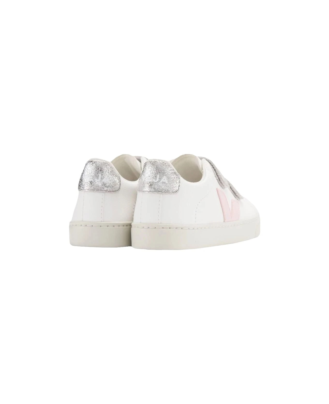 White Esplar ChromeFree sneakers by Veja Kids made of ChromeFree cowhide and characterized by a round toe, pink V logo on the external side, silver spoiler with white logo and closure with silver hook and loop straps. ChromeFree cowhide is smooth and lightweight. Coming from farms located in southern Brazil (Rio Grande do Sul), it is subjected to an innovative tanning process in which no chromium, heavy metals or dangerous acids are involved. By simplifying the tanning process, the use of chemicals and energy is limited, the use of water is reduced by approximately 40% and the use of salt by 80%. After tanning, the water is recyclable. ChromeFree leather is used across the entire Kids leather collection. Suede is made from the underside of cowhide that has been previously brushed to make it softer and more flexible. It comes from farms in southern Brazil (Rio Grande do Sul). It is tanned in Brazil, respecting REACH regulations. Particular attention is paid to the use of water during the tanning process. The suede is also coated with water-repellent oils without PFCs (chemical compounds) to protect the sneakers from light rain.