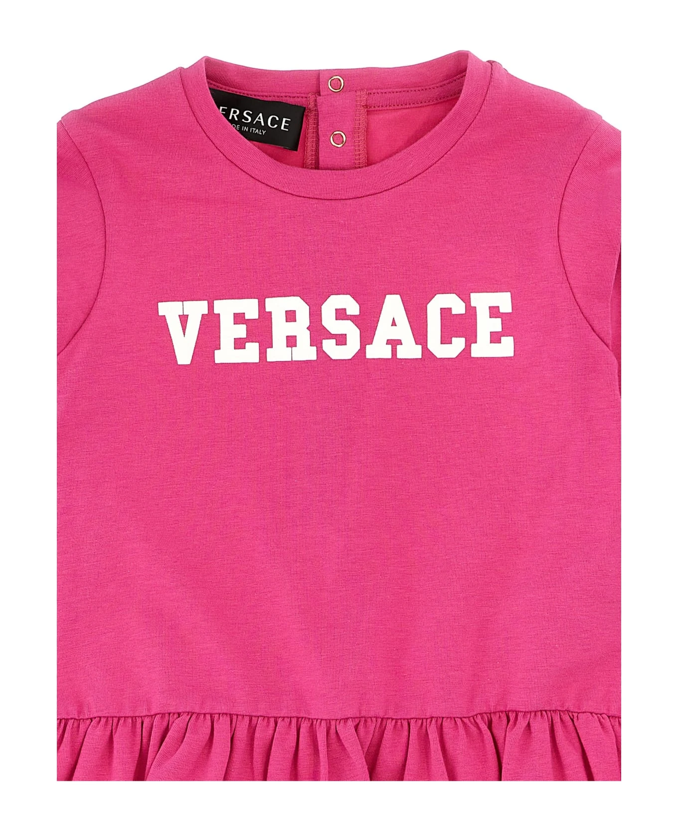 Stretch cotton dress with front logo print, crew neck, long sleeves, flounced skirt.