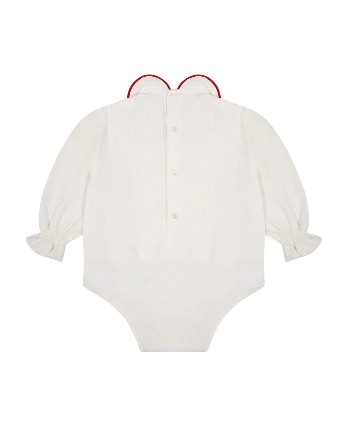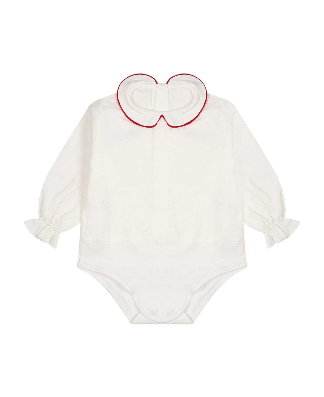 White cotton shirt, long sleeves, with rounded collar, button closure on the back, snap buttons between the legs and elasticated cuffs. It is embellished with red velvet profiles.